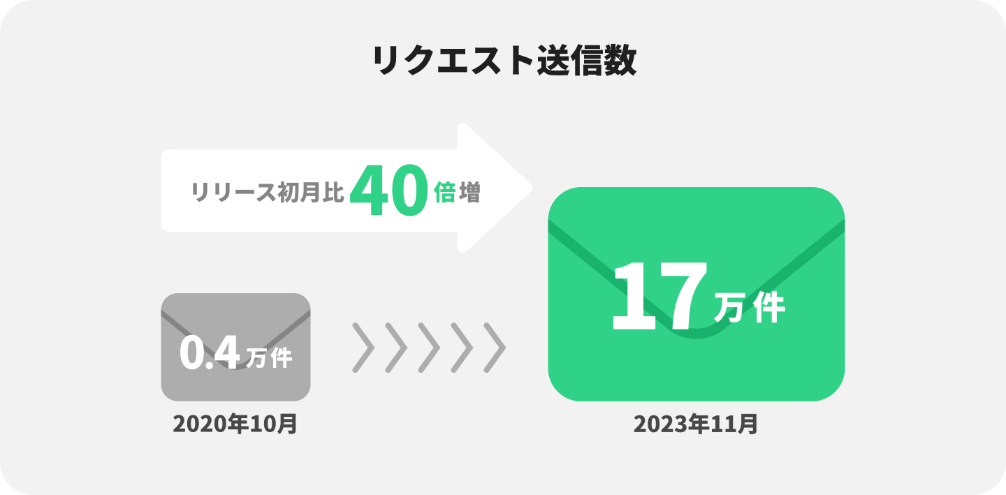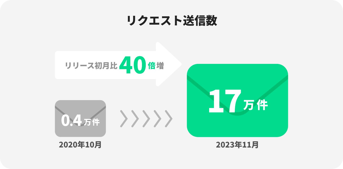 サービス開始から2023年11月までの3年間でクリエイターに送られたリクエストの数は17万件を超え、リリース初月に比べて40倍以上に成長しました。利用者は13万人を超え、多くのクリエイターとファンの皆さまに、リクエストを通じたコミュニケーションをお楽しみいただいていることを心より感謝しております。