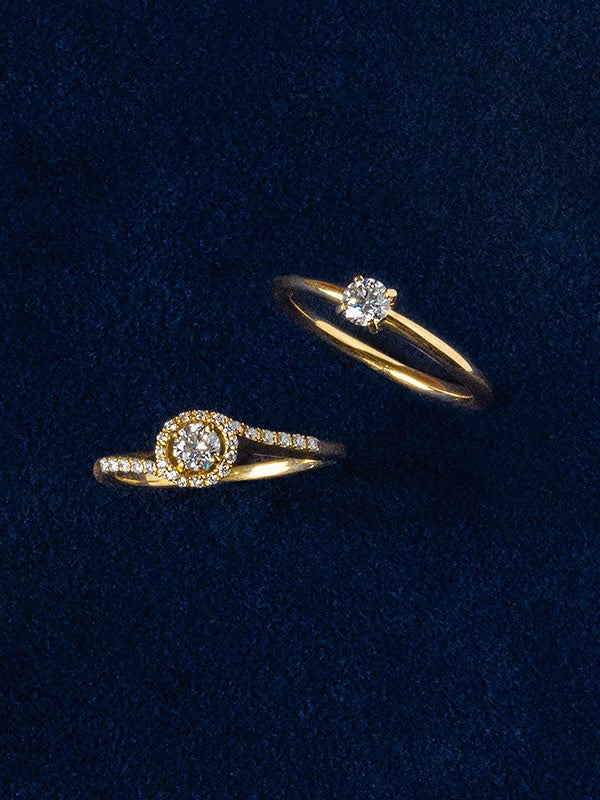 エンゲージメントリングは、VS-1ダイヤの輝きを引き立たせる4本爪のクラシカルなデザインの他、0.21ctダイヤモンドをメレーダイヤが贅沢に取り巻く流れるようなデザインリングの2型を展開。