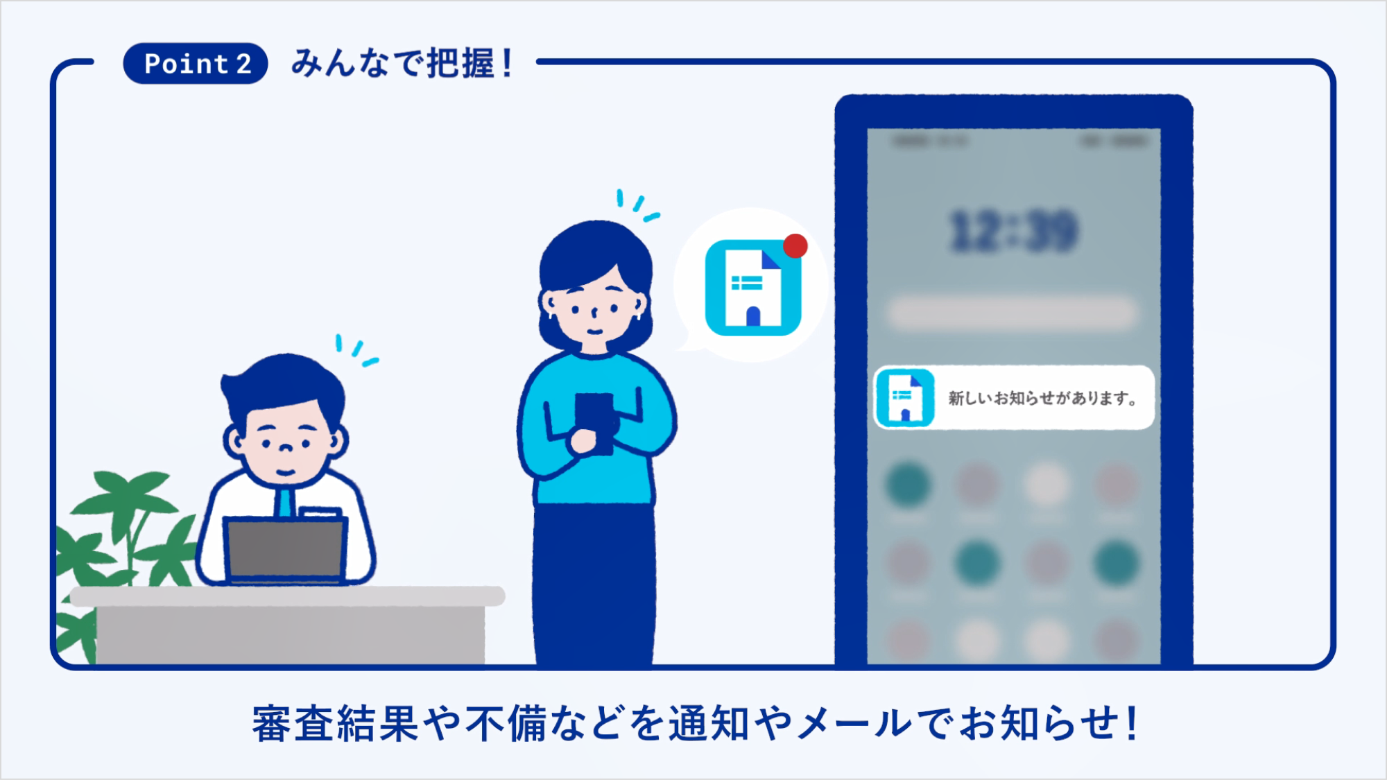 お客さまにも不動産事業者にも審査結果や不備のご連絡などプッシュ通知やメールでお知らせするので、すばやく情報をキャッチし、次のステップへ進められます。