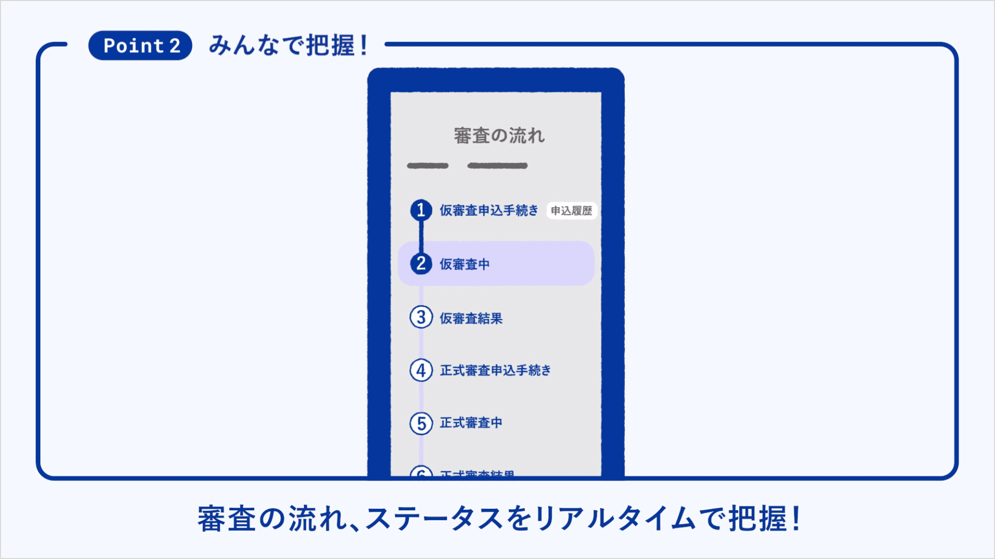 お手続きの進捗状況をリアルタイムでチェックできるので、お客さまと不動産事業者は現状のステータスを把握することが可能となり、お手続きがスムーズに進められます。
