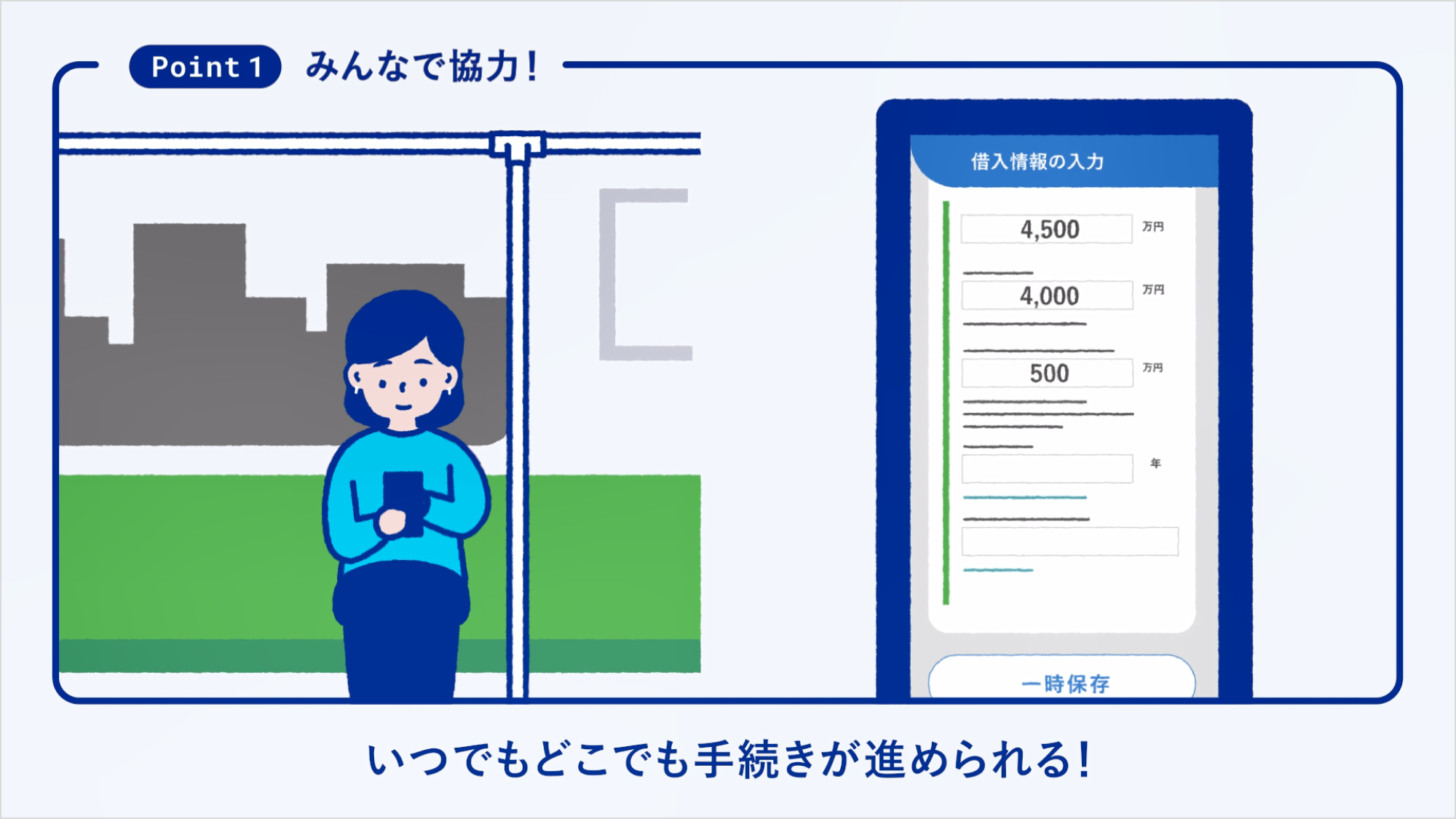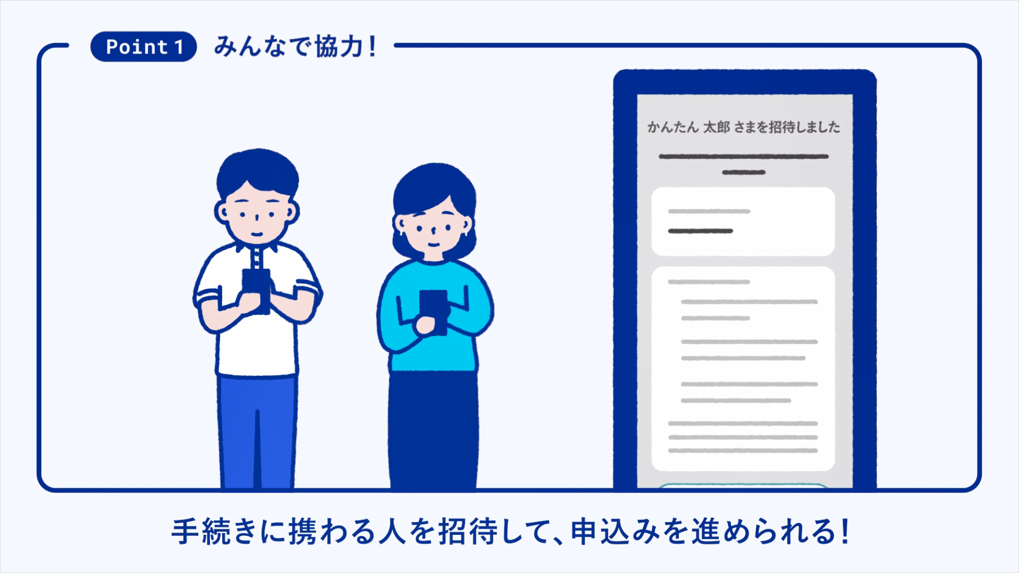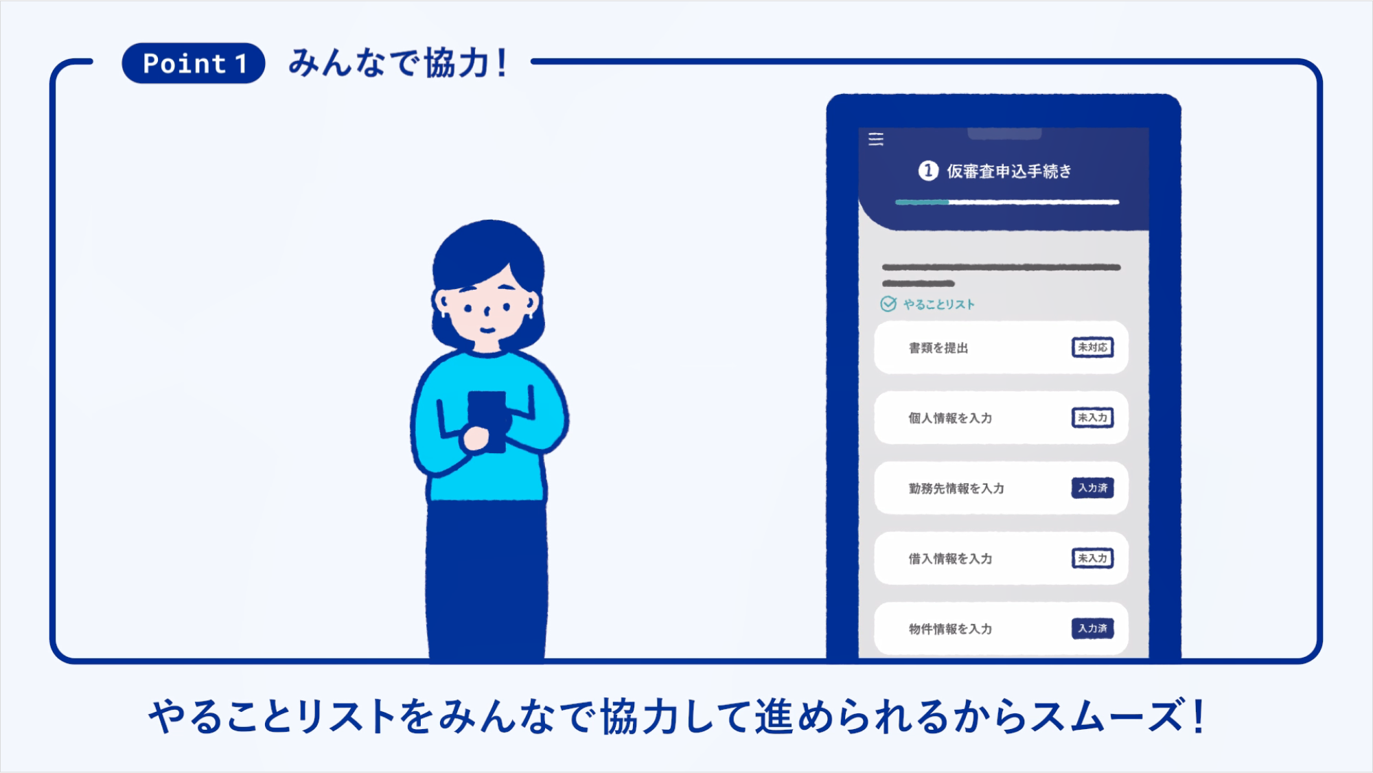 ペアローンのパートナー・連帯保証人と一緒にお手続きを進められるほか、不動産事業者の担当者を招待できるので、手続きに携わる人みんなで協力して進めることができます。