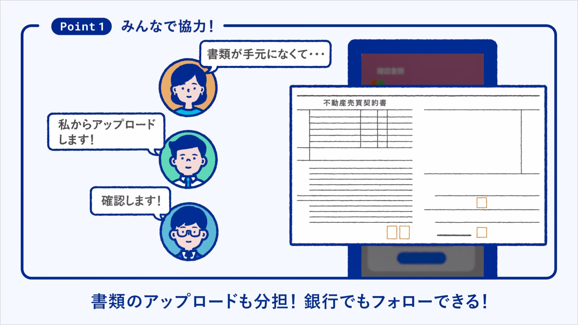 書類のアップロードもお客さまだけではなく、不動産事業者と協力しながら対応できます。物件関係書類は不動産事業者がアップロードするなど役割分担することでスムーズにお手続きを進めることができます。