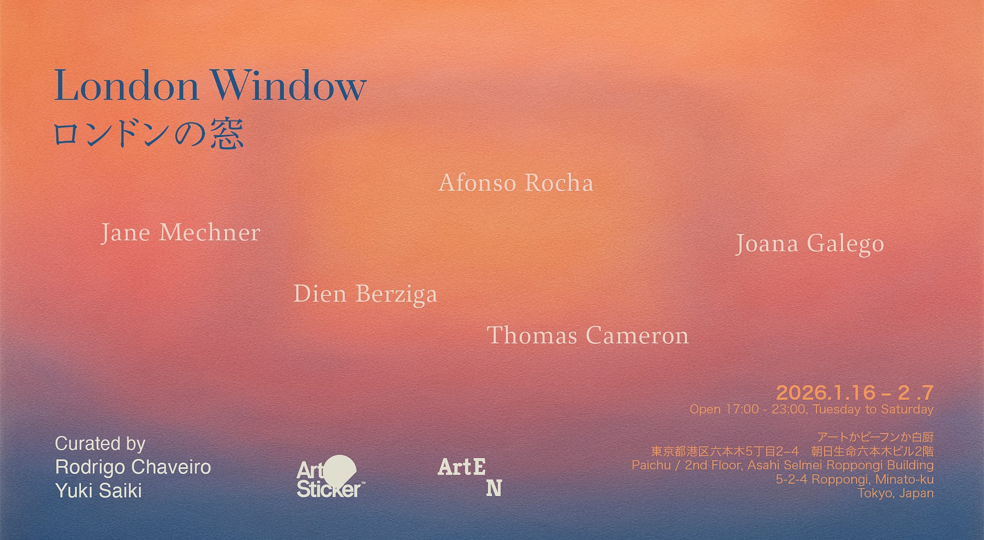 本展は、ロドリゴ・シャベイロと齋木優城による共同キュレーションのもと、Art Embassy Network (ArtEN)とArtStickerのパートナーシップにより企画され、日本と英国のアートシーンの重要な架け橋となるものです。この展覧会という窓を通じて、国際的なアーティストたちの作品を通じて、ロンドンの「今」を覗いてみましょう。国際的な大都市で共生する人々の生活や個人的な物語は、この場所で私たちにどんなメッセージを伝えてくれるのでしょうか?