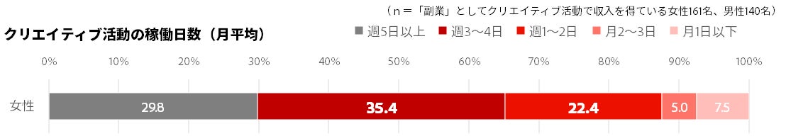 一方で、副業クリエイターの女性の稼働日数に着目をすると、月平均 週4日未満でクリエイティブ活動をしている女性は約7割と、女性の副業クリエイターの多くがスポットとしてクリエイティブ活動に励んでいることがわかりました。