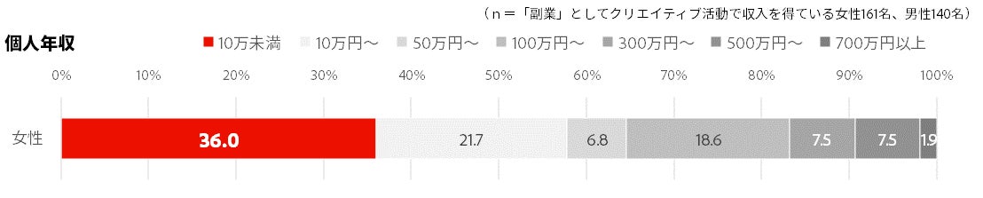 副業としてクリエイティブ活動で収入を得ている方の収入の実態は、どうなっているのでしょうか。調査結果は以下のとおりで、女性の場合、年収は「10万円以下(36.0%)」が最も多い結果となりました。