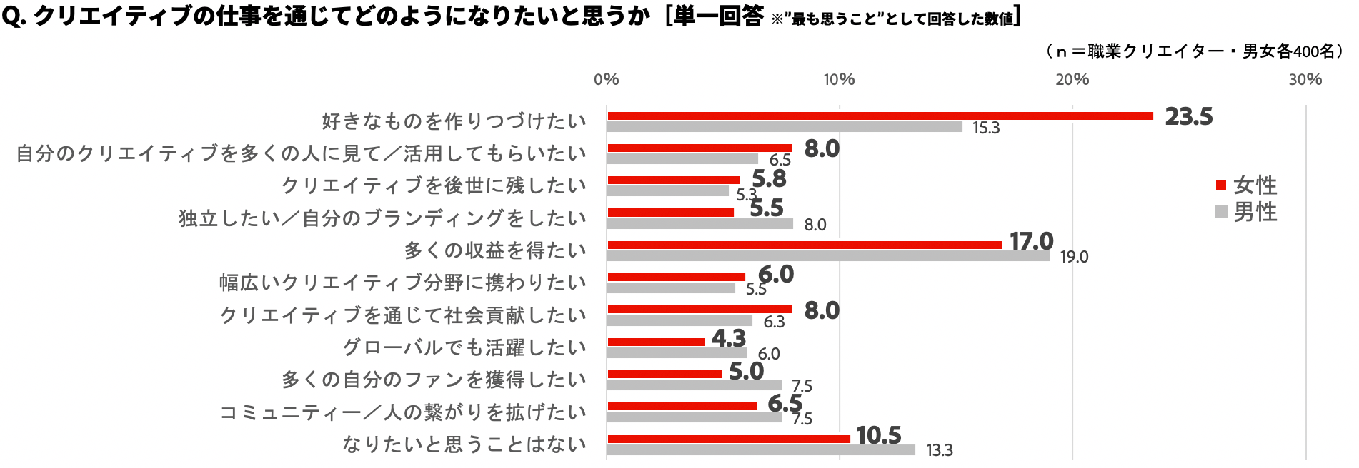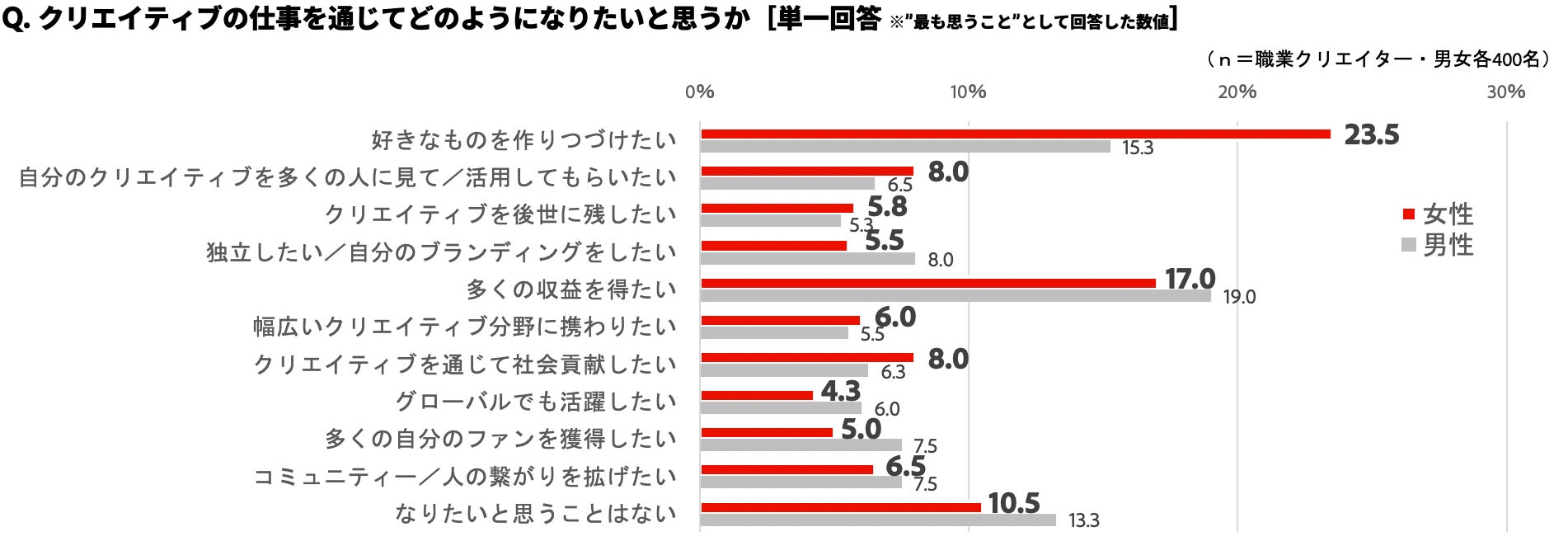 続いて、「クリエイティブの仕事を通じてどのようになりたいか」を尋ねると、『好きなものを作り続けたい』が女性:23.5%で最も高く数字が出ました。男性クリエイターと比較しても、女性クリエイターのほうが「好き」を仕事のモチベーションとしている傾向がみられました。