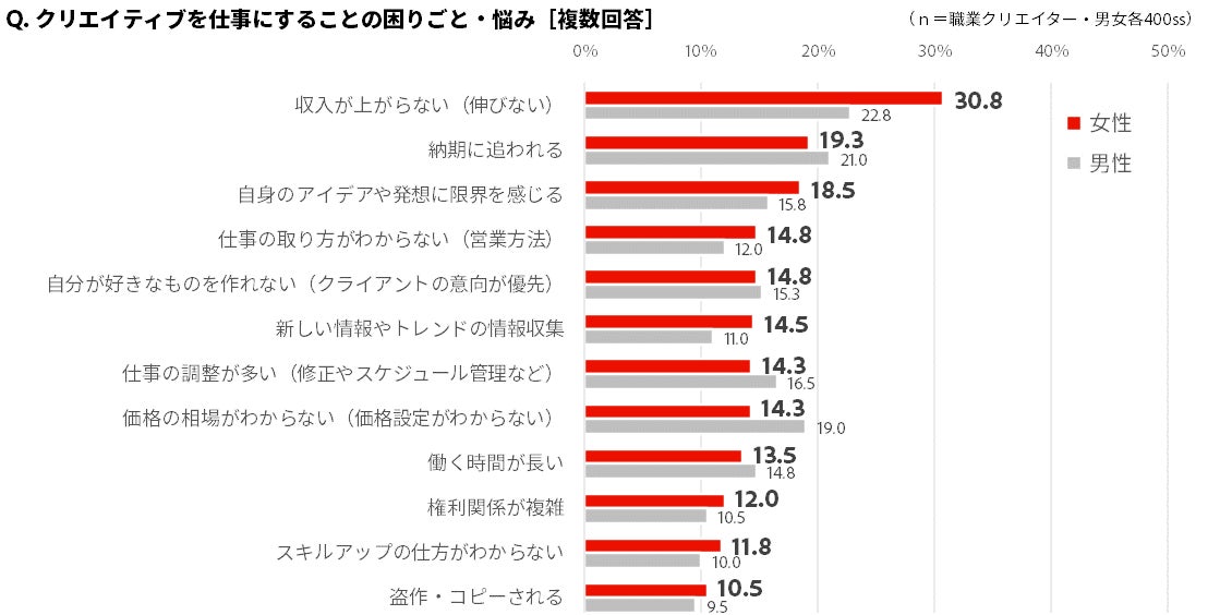 女性クリエイターの困りごと・悩みの1位は「収入」という結果に。