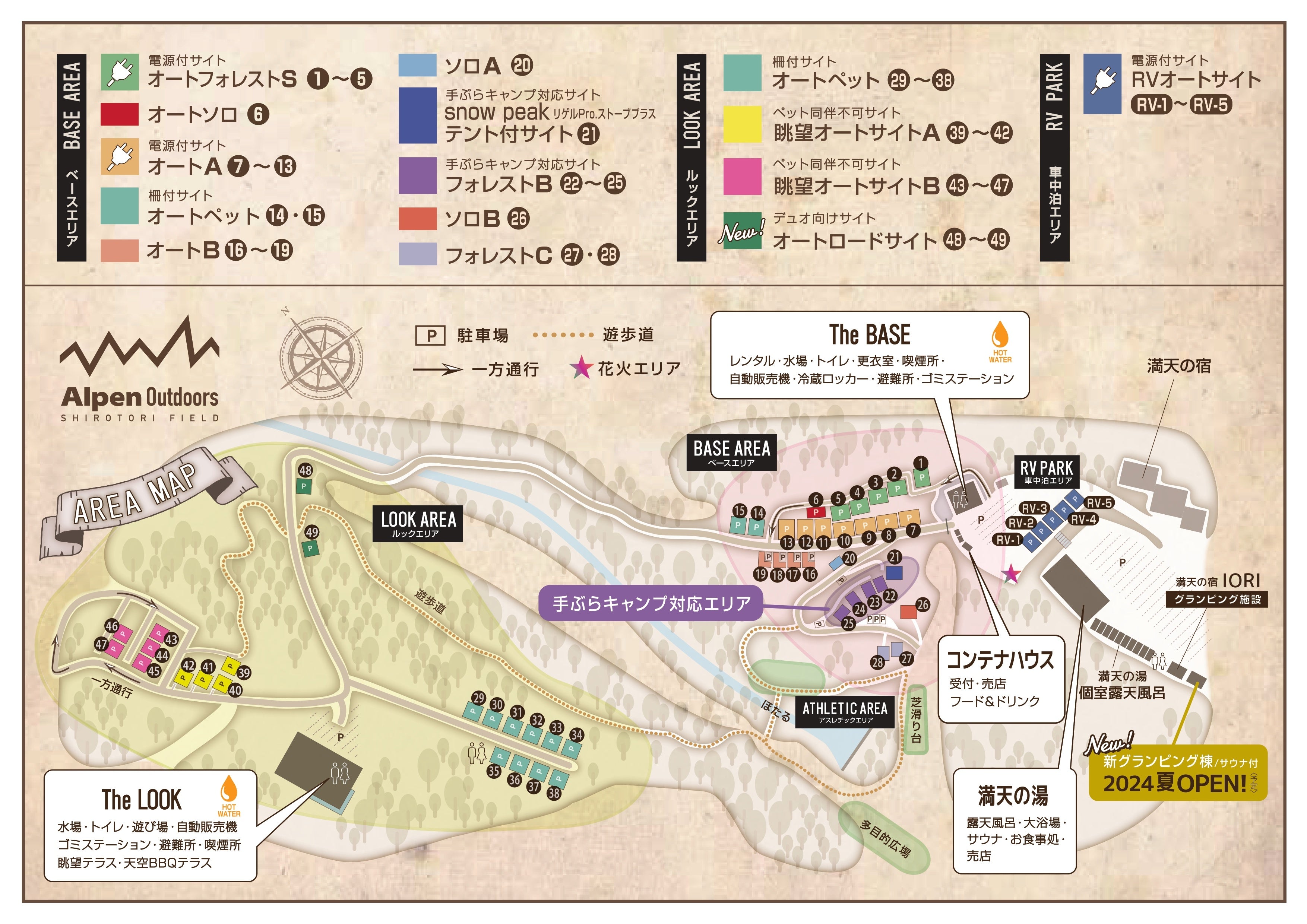 しろとりフィールドのサイトは、受付コンテナや温泉にもアクセスしやすいThe BASEエリアと中腹にあるThe LOOKエリアに別れており、森の中の木立が気持ちいいフォレストサイト、車を横つけできるオートサイト、眺望がすばらしい眺望サイトなどバリエーションが豊富!位置や大きさ、電源の有無、森の中など人数やシーン、お好みのスタイルにあわせてご利用いただけます。今年からLOOKエリアは柵付ペットサイトと、ペット不可のサイトとを別け、ペットの同伴の有無でもお選びいただけるようになりました。さらには2人用のデュオサイトも2サイト新設。