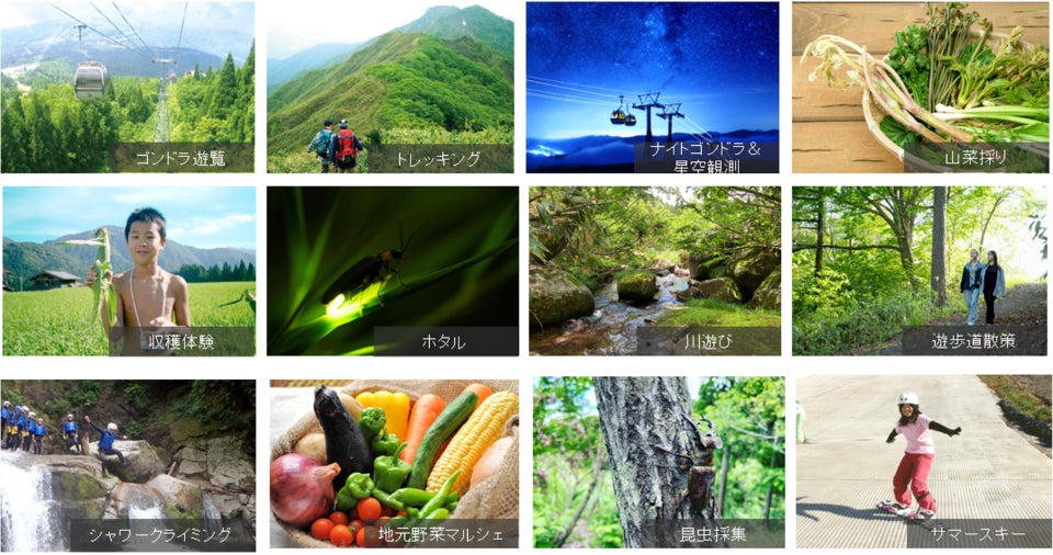 キャンプ場では、ゴンドラ遊覧、トレッキング、ナイトゴンドラ、星空観測、山菜採り、野菜の収穫体験、ホタル観賞、川遊び、遊歩道散策、シャワークライミング、野菜マルシェ、昆虫採集、サマースキー、スノーボードなど都会では味わうことのできない体験でいっぱいです。