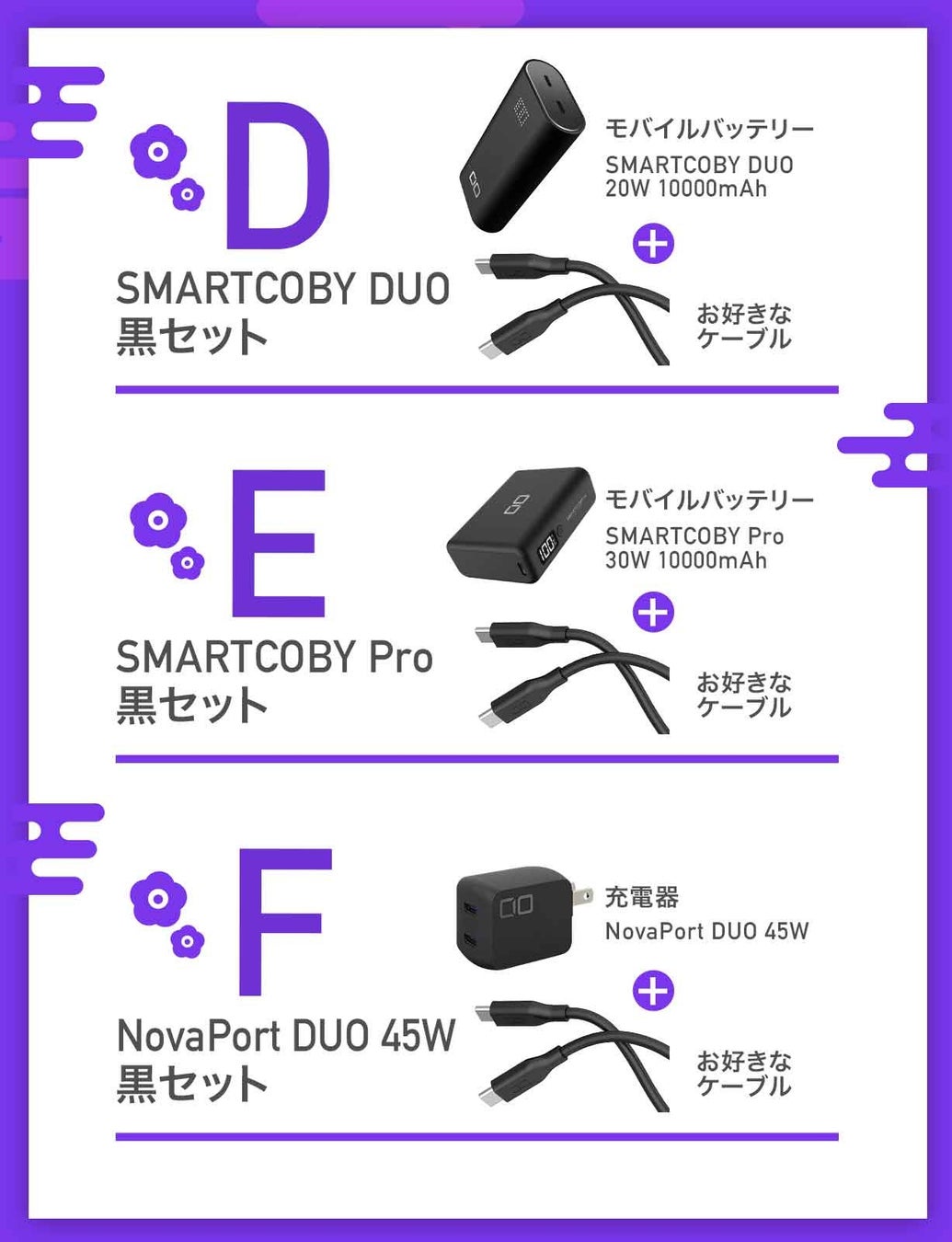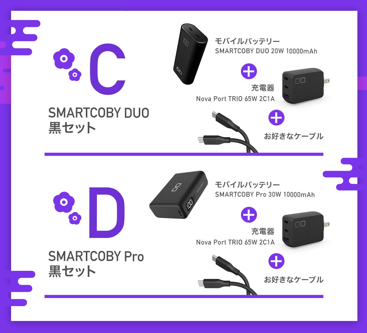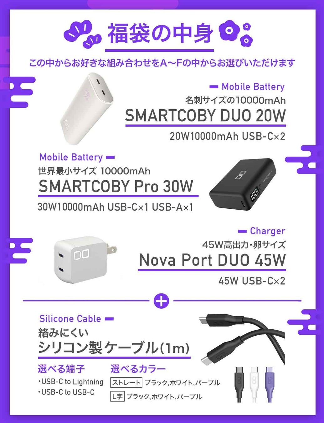 モバイルバッテリー+充電器+シリコン充電ケーブル+シークレット2種の組み合わせとなります。