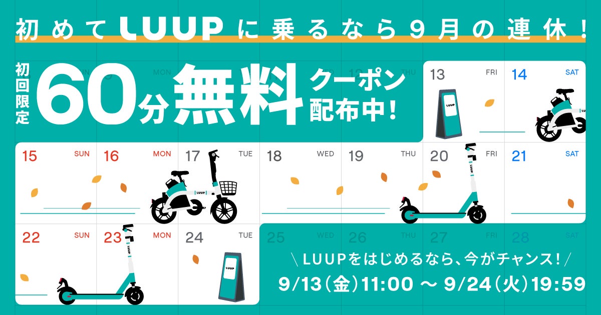 9月13日(金)から9月24日(火)まで、「初めてLUUPに乗るなら9月の連休!60分ライド無料キャンペーン」開催