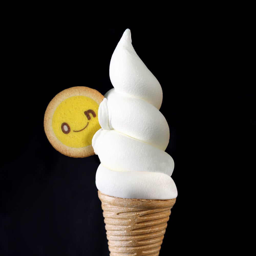 onちゃんクッキーをのせたミルキーでふわふわのソフトクリーム
