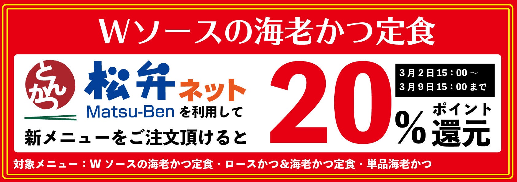 ▽キャンペーン内容 松弁ネットにて期間内に受取り時間を指定しご注文いただいたお客様へ、 松弁ポイント通常10%還元のところ20%還元。お買い上げ10円毎に2ポイント加算いたします。 ※キャンペーン対象日時は、受取日時が基準です。 ※松弁デリバリーは本キャンペーンの対象外となり、10%ポイント還元となります。 ※モバイルオーダーは本キャンペーンの対象外となり、3%還元となります。