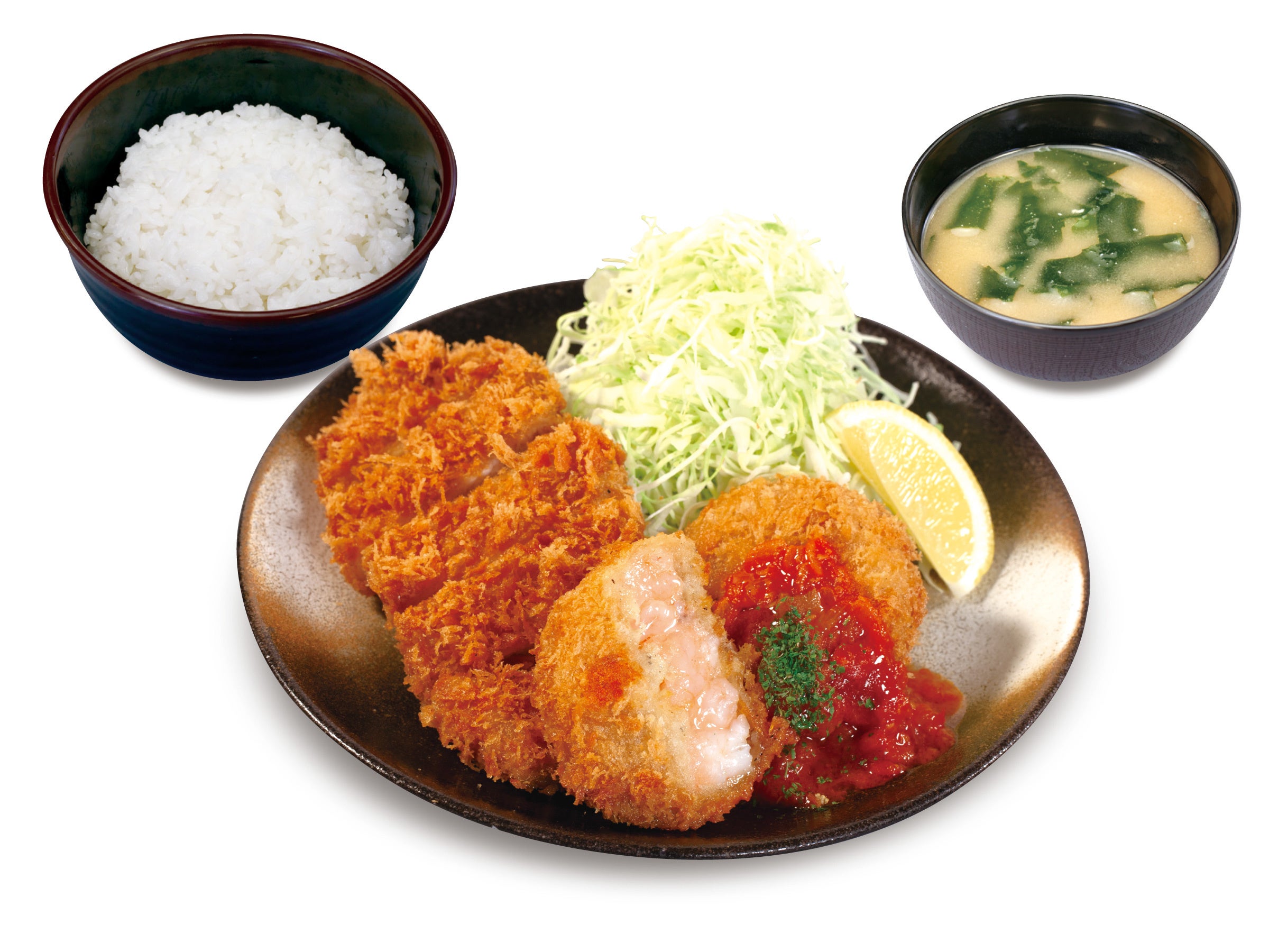 海老の旨味たっぷり「海老かつ」が期間限定で復活。サクサクの衣の中から海老の旨味が溢れんばかりの贅沢な逸品。ごろごろ入った海老がぎゅぎゅっと詰まった“萌え断”で食欲をそそります。やみつき必至の松のや特製香草入り“タルタルソース”とさっぱり“トマトソース”の2種類の味が同時に楽しめる「Wソースの海老かつ定食」は大満足の美味しさ。また、海老もお肉も堪能したい欲張りさんには自慢のロースかつとの盛合せ「ロースかつ&海老かつ定食」もおすすめ。もちろんテイクアウトも可能です。お持ち帰りでいつもの食卓に贅沢をプラス。単品のお惣菜のご用意もございますので、食卓の“もう一品”にも、お弁当のおかずにも。旨味たっぷり、ぷりっぷりな「海老かつ」をぜひご賞味ください。
