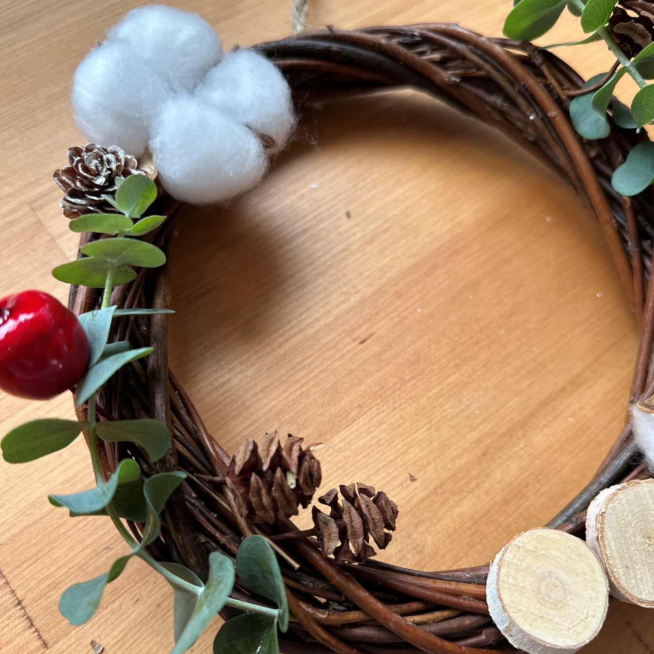本物の木のベースに、まつぼっくりやドライフラワーなどの自然素材のアイテムを飾り付けて、秋を感じるオリジナルリースを作ることができます。