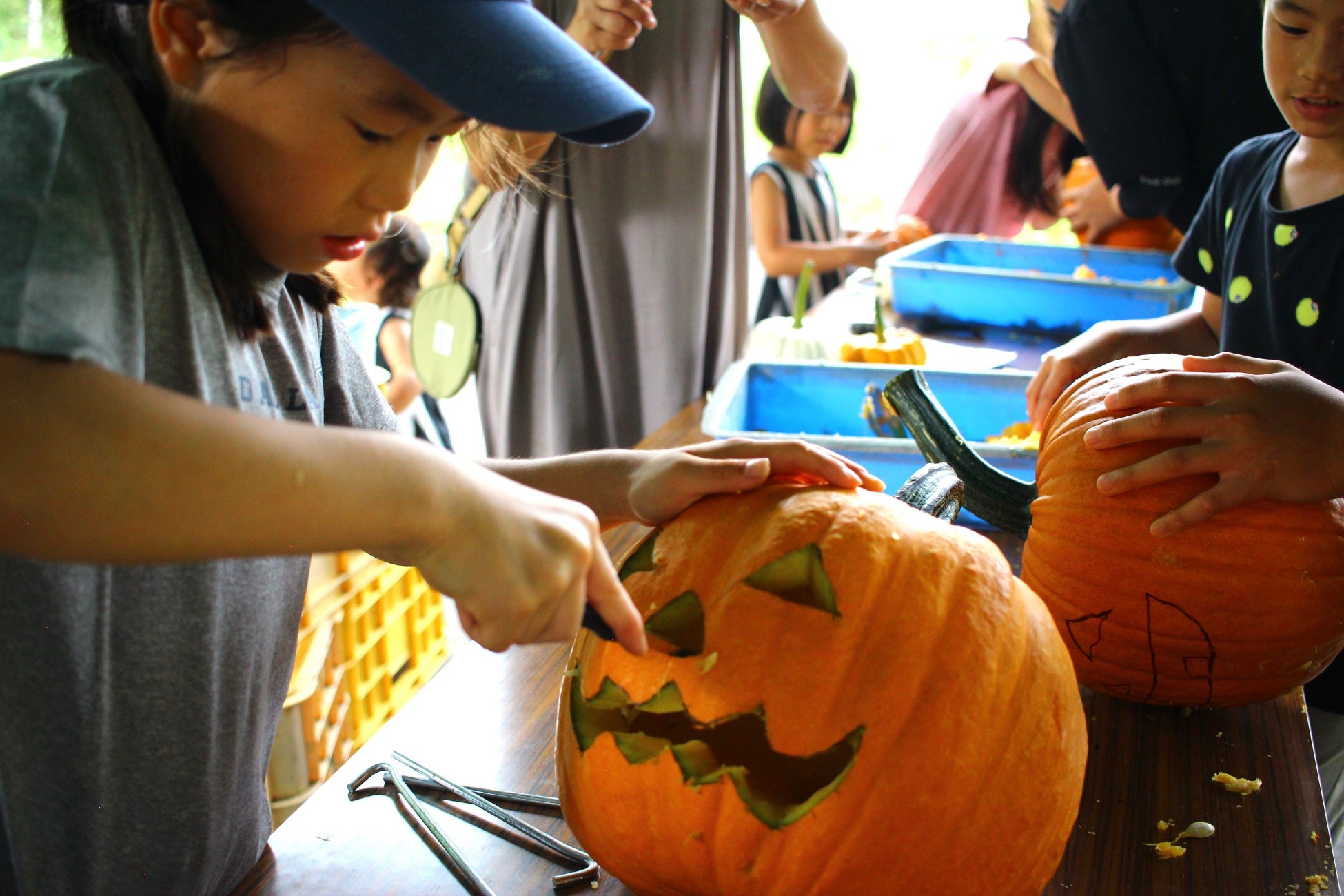 大きなカボチャをナイフでカービングします。目や鼻を描いたり、模様を描いたり、自由にくりぬいてオリジナルのジャック・オ・ランタンを作ることができます。