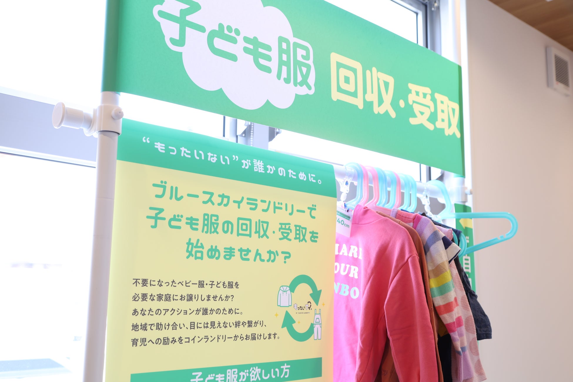 ジーアイビーは、コインランドリー「ブルースカイランドリー」を展開する中で、「“もったいない”が誰かのために。」というスローガンのもと、子ども服リユース活動に取り組んでいます。