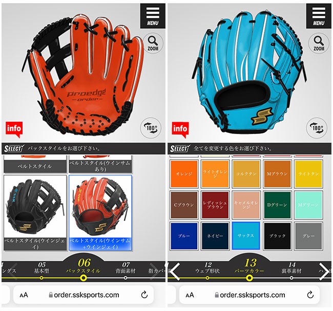 スマートフォンで簡単にデザインできる「プロエッジオーダーグラブ」シミュレーションは、3Dグラフィックで感覚的に操作可能。38の基本型(ミット含む)、60種類のウェブパーツ、21色のパーツカラー(軟式は22色)、16種類のラベルなど、組み合わせは無限!?