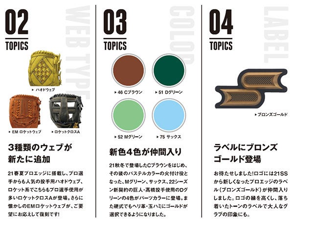 また、22シーズン新契約を結んだ、栗林良吏選手(広島東洋カープ)、高橋優貴選手(読売ジャイアンツ)はじめ、各契約選手の仕様も紹介、憧れの選手の型に近いオーダーもしていただきやすくなりました。