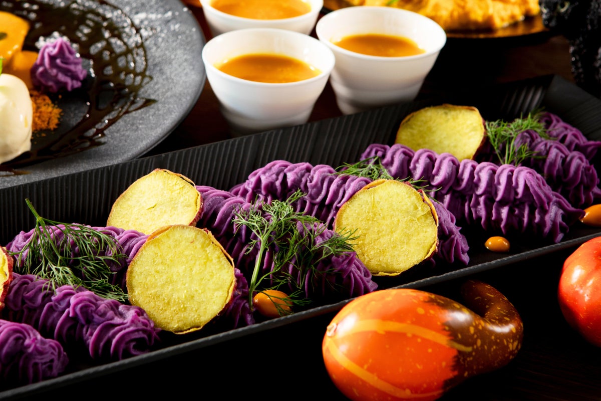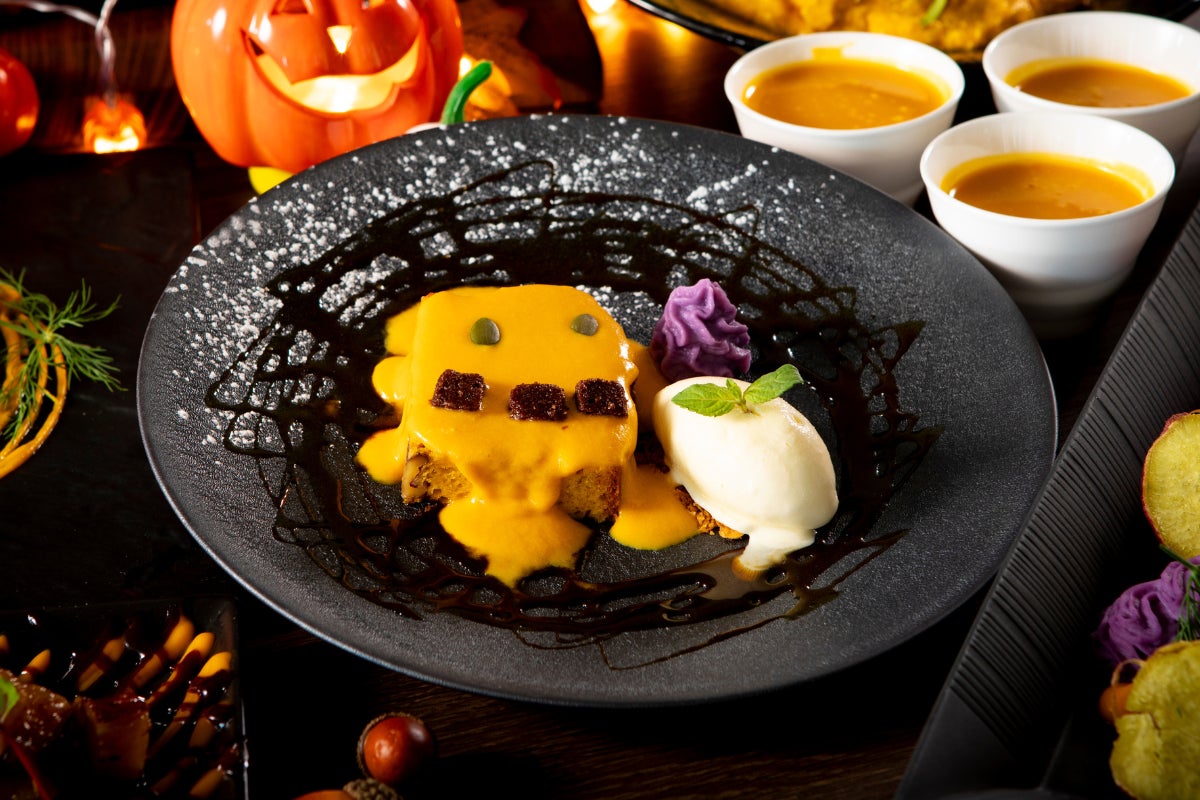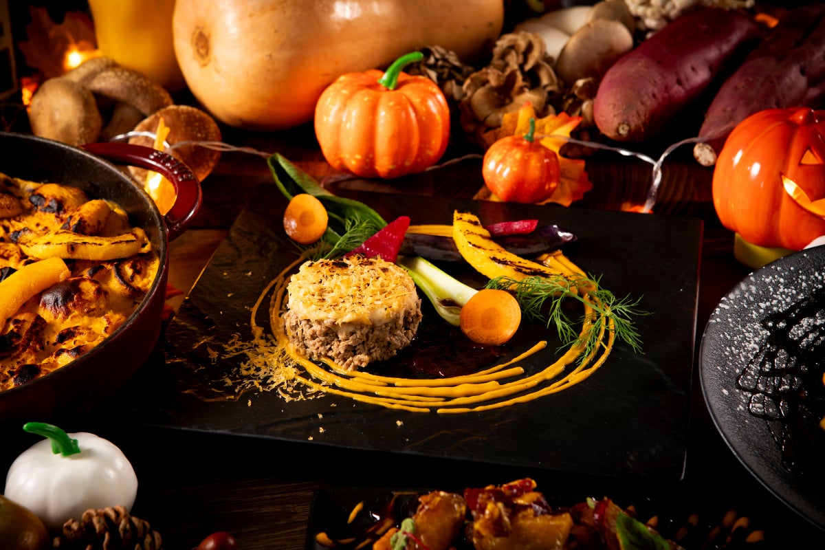 「かぼちゃのパン・プディング」「さつまいものロースト~あまーいメープル風味~」「キモカワ紅いものサラダ」など、カラフルなオードブルが勢揃いする。本格フレンチのシェフが作る「濃厚かぼちゃのポタージュ」は、かぼちゃ本来の味をご堪能いただける一品となっている。