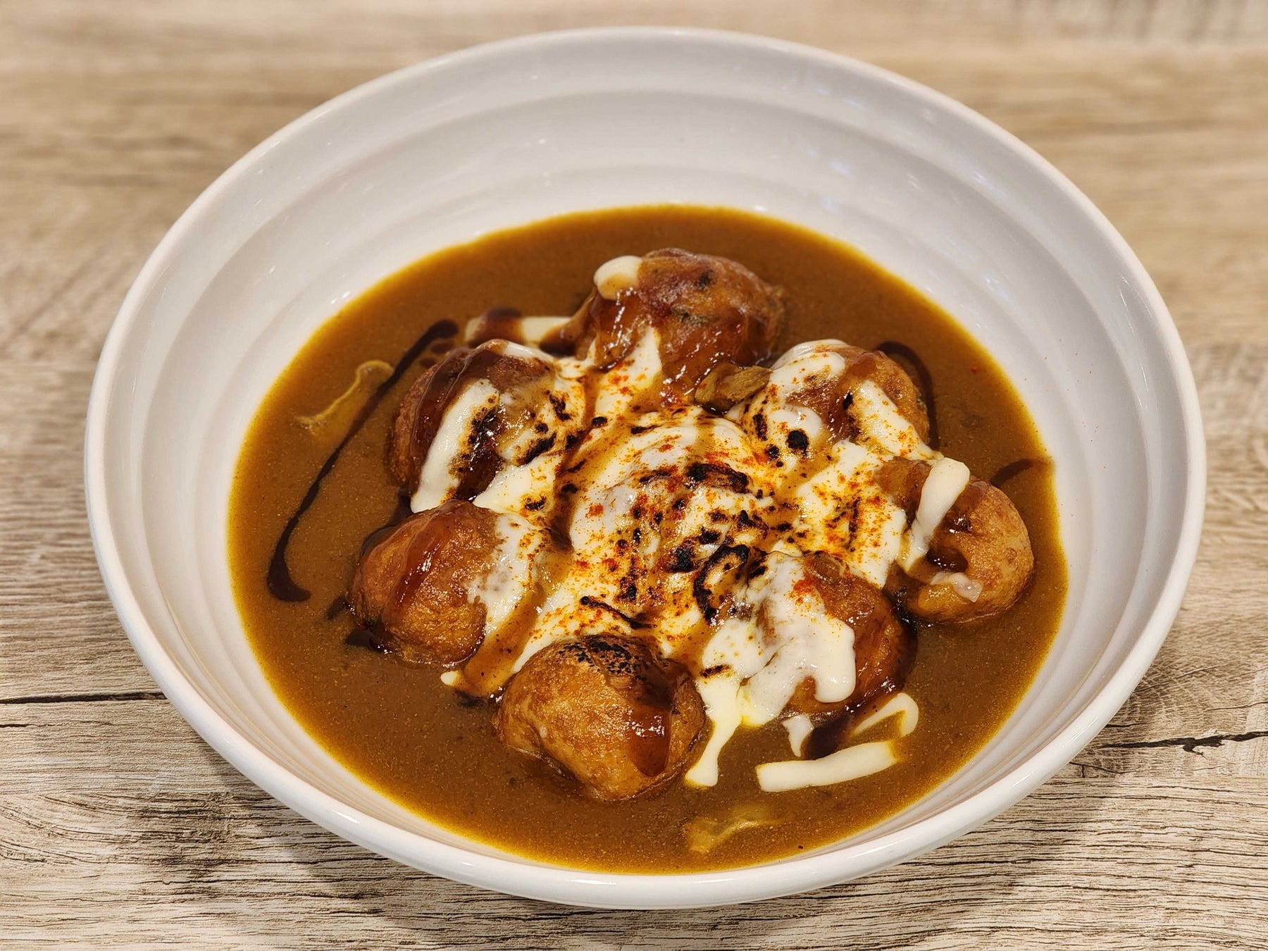 商品説明:出汁の効いたたこ焼きに「油かす」の旨みがしっかり出た和風カレーソースをトッピングしました。