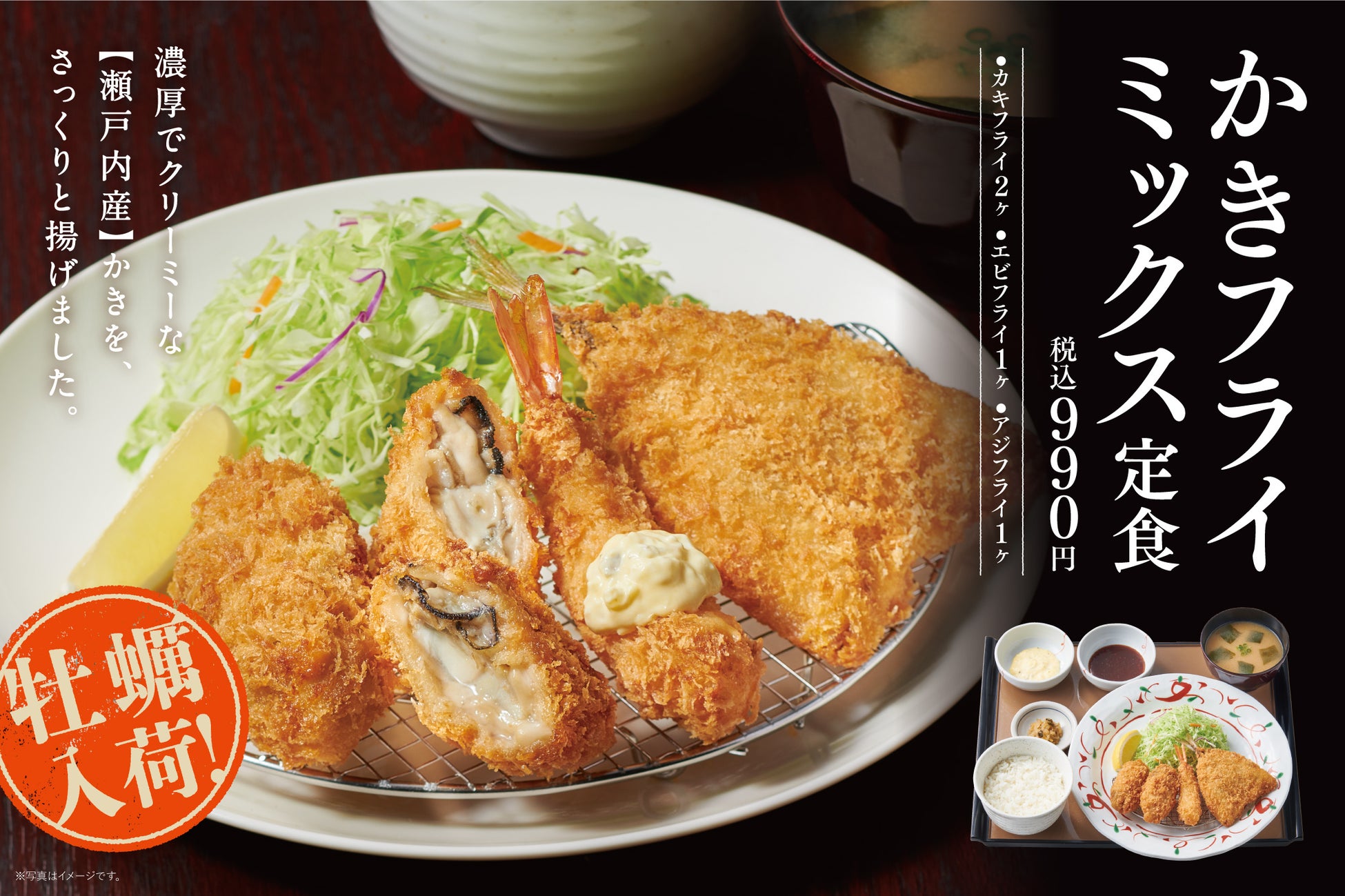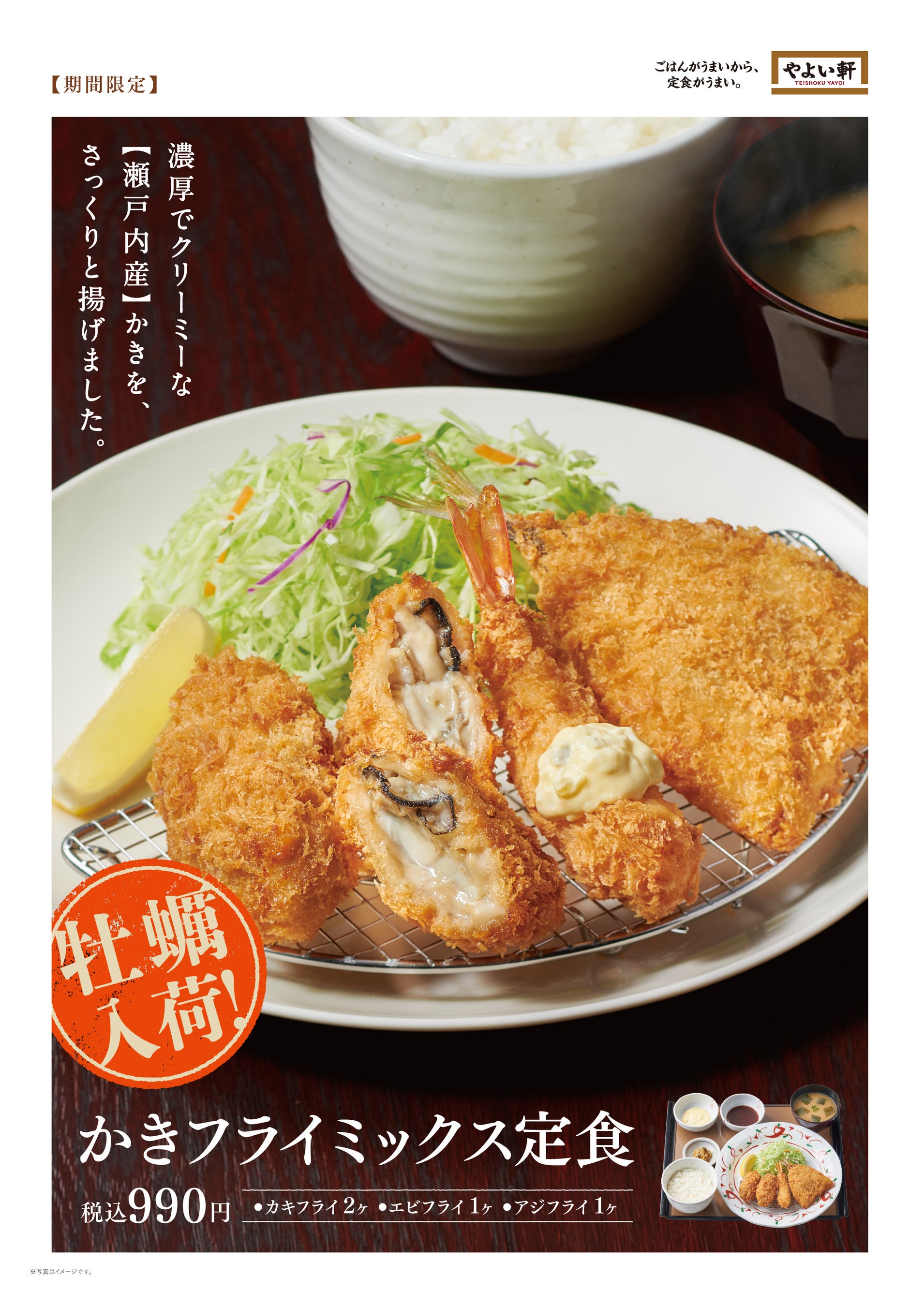 「やよい軒」瀬戸内産のジューシーで大粒な牡蠣を堪能!ミックスフライのバラエティ定食!かきフライミックス定食 990円 10月18日(火)新発売