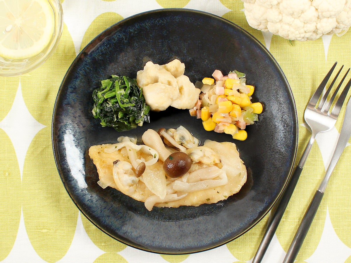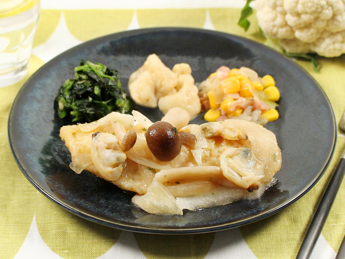 ふっくらと揚げた白身魚を、魚介のだしをきかせたアクアパッツァソースで爽やかなプレートに仕上げました。付け合わせにしめじ、あさり、たまねぎを使用した白ワインの香る1品です。