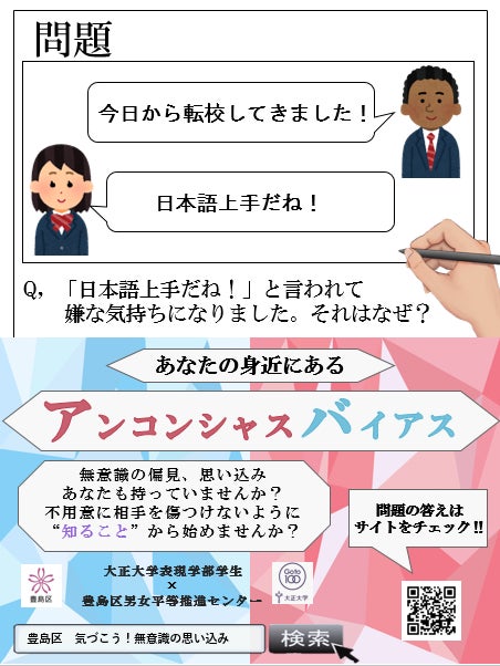 大正大学(学長:神達知純、所在地:東京都豊島区)の表現学部表現文化学科アート&エンターテインメントワークコース(現:メディア表現学科)2年生の学生有志5名が、豊島区男女平等推進センターと共同し、「アンコンシャスバイアス※」の認知度UPを目指したポスターの作成を行いました。