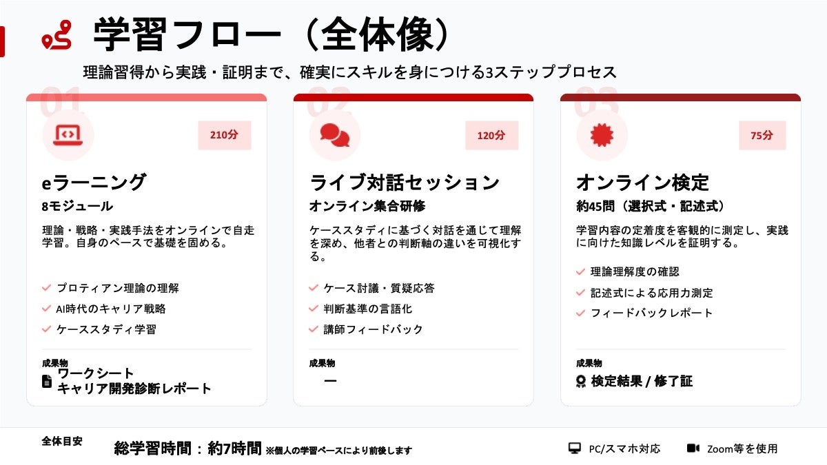 新講座は、変化の時代を生き抜くための「生き方」と「行動変容」を体系的に習得する実践プログラムです。ビジネスパーソンや人材育成担当者、キャリア支援希望者を対象に、総学習時間(検定含む)約7時間の以下3ステップで構成されています。