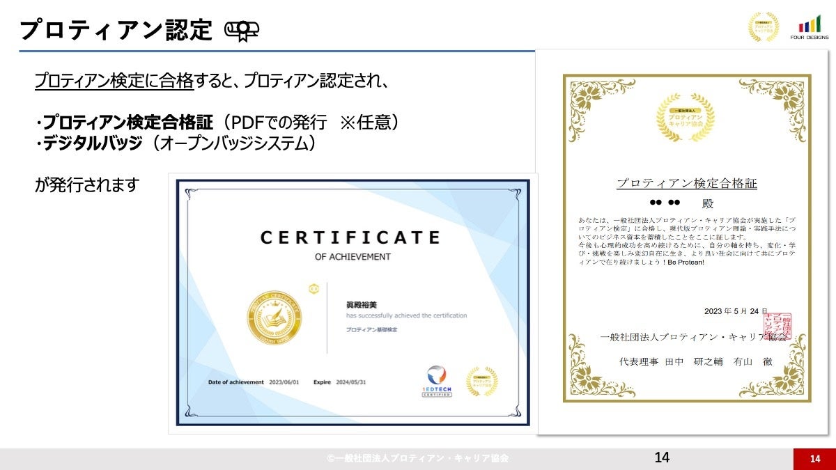 学習内容の定着度を客観的に測定します。検定に合格すると「プロティアン認定」として合格証およびデジタルバッジ(オープンバッジ)が発行されます。