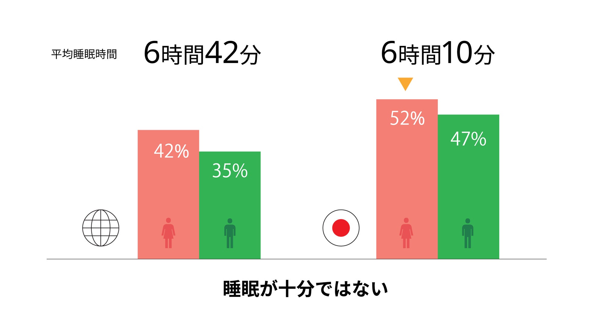 日本は、調査対象の57の国・地域の中で、平均睡眠時間が最下位でした。よって日本の男女ともに睡眠が十分でないと感じている割合は世界平均よりも高く、さらに日本の女性は52%と半数を超えています。
