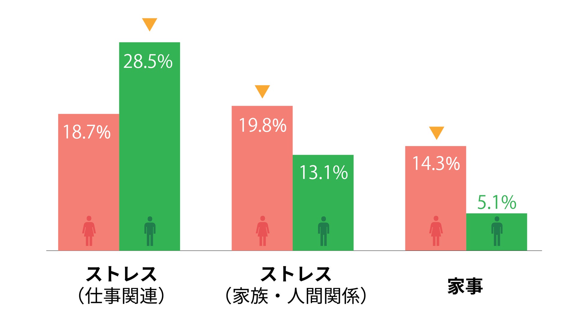 男性は主に仕事に、女性は家族や人間関係にストレスを感じているようです。男性は一家の稼ぎ手としての重圧、女性は家事や育児などの負担という性別的役割が色濃く残っていることが推測でき、これらも大きく睡眠に影響しているようです。