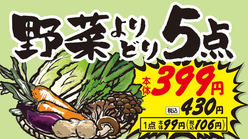 約20アイテムの野菜を1点106円(税込)、よりどり5点で430円(税込)で自由にお選びいただけるコーナーです。実質1点分が無料になる大変お得な企画で、お買い得感と選ぶ楽しさをご提供いたします。