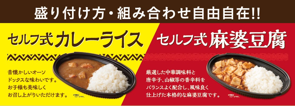 大人気の「セルフ式カレーライス」に加え、「セルフ式麻婆豆腐」が新登場!盛り付け方・組み合わせは自由自在で、蓋が閉まれば盛り放題!ご飯を挟んで両サイドにカレーと麻婆豆腐を盛ってもOKです!