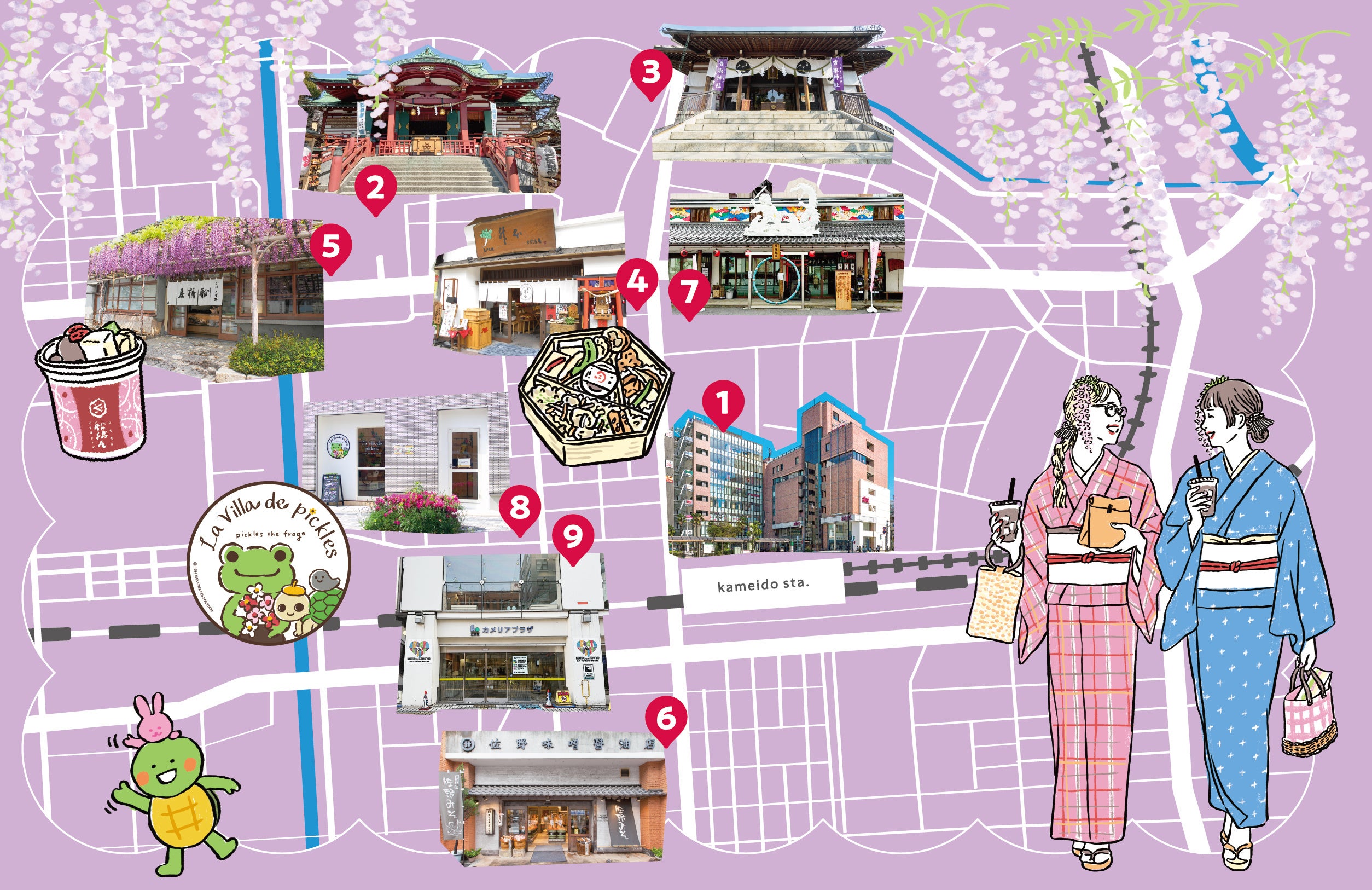 「藤を楽しむ 亀戸さんぽ日和」を制作。亀戸の名所や船橋屋、亀戸升本など、亀戸の名物が散りばめられています。