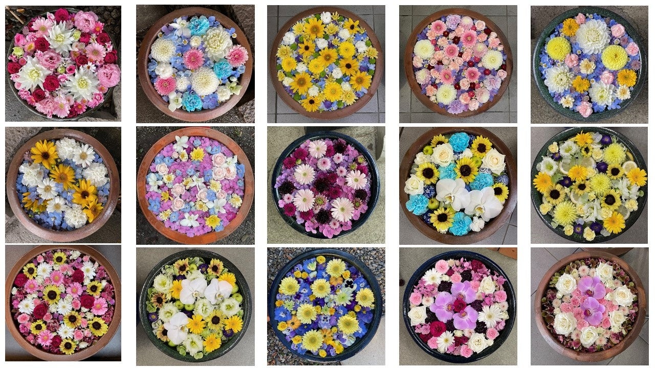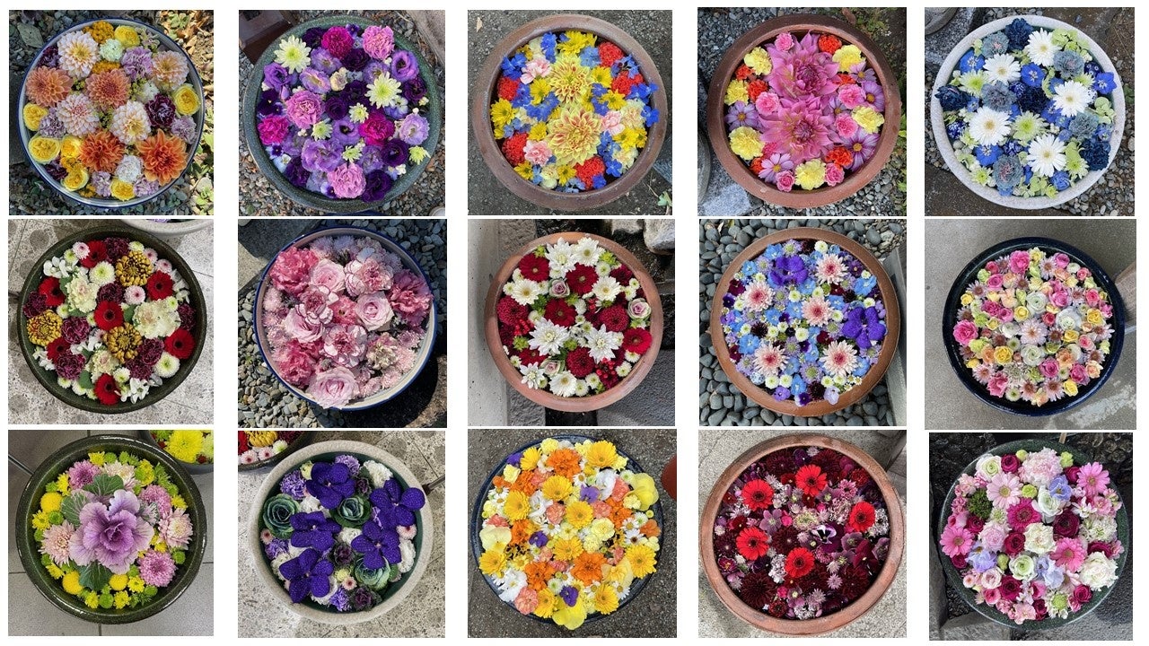 ※花手水(はなちょうず):参拝前に手や口を清めるために設けられた神社の手水舎(ちょうずしゃ)や睡蓮鉢に、色とりどりの花を浮かべたもの