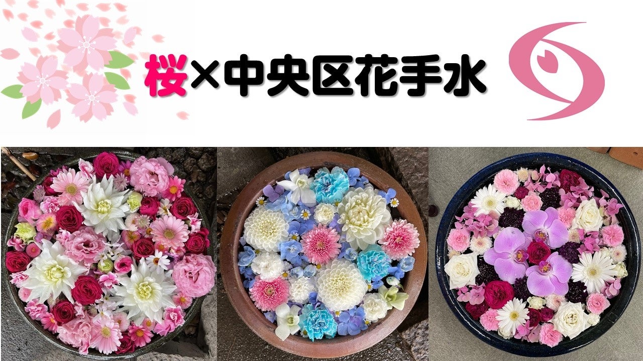 中央区のシンボルである桜と中央区花手水の期間限定のコラボレーションです