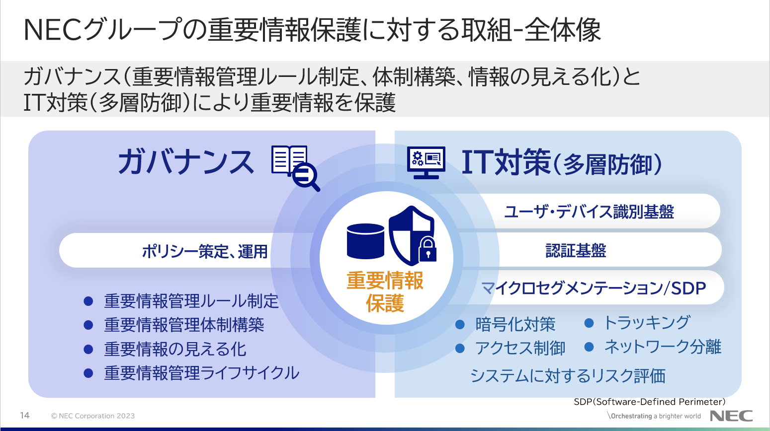 本セミナーでは、NECでの重要情報に対するセキュリティ対策(ガバナンス・IT対策)のノウハウや実践を踏まえ、対策を実現する事例をご紹介いたします。