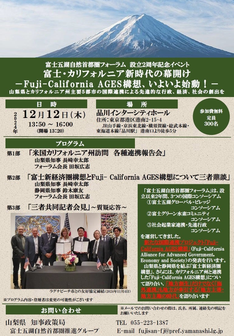 ◆山梨県(知事:長崎幸太郎)が主宰する「富士五湖自然首都圏フォーラム(以下フォーラム)」(会長:田坂広志)は、『富士・カリフォルニア新時代の幕開け- Fuji-California AGES構想、いよいよ始動!-山梨県とカリフォルニア州主要5都市の国際連携による先進的な行政、経済、社会の創出』というテーマを掲げ、フォーラム設立2周年記念イベントを開催します。