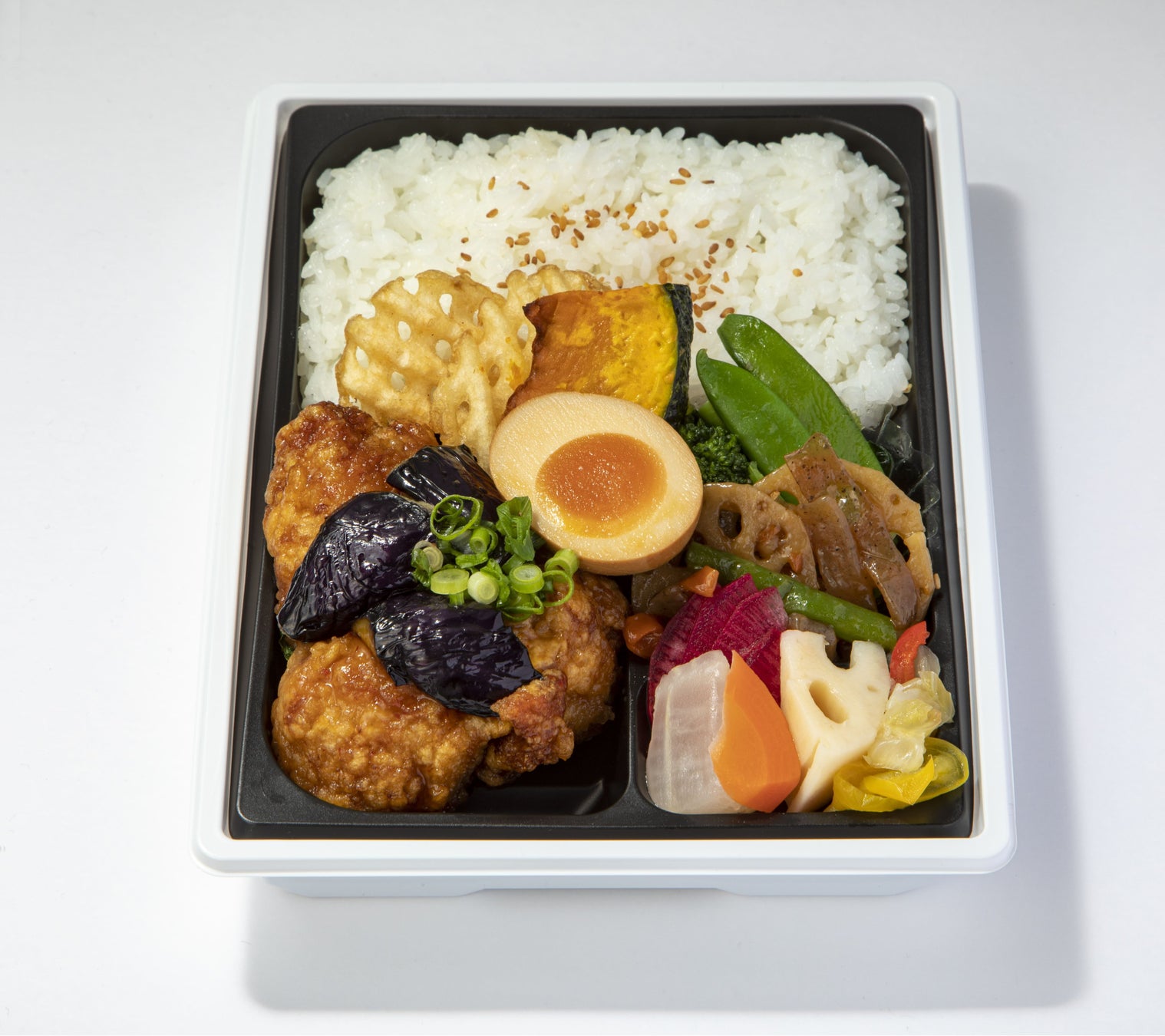 甘辛いタレで合えた鶏唐揚げがたっぷり入ったボリューム満点のお弁当です。茄子、れんこん、スナップえんどうなどの野菜もふんだんに入っており、満足度が高い一品です。