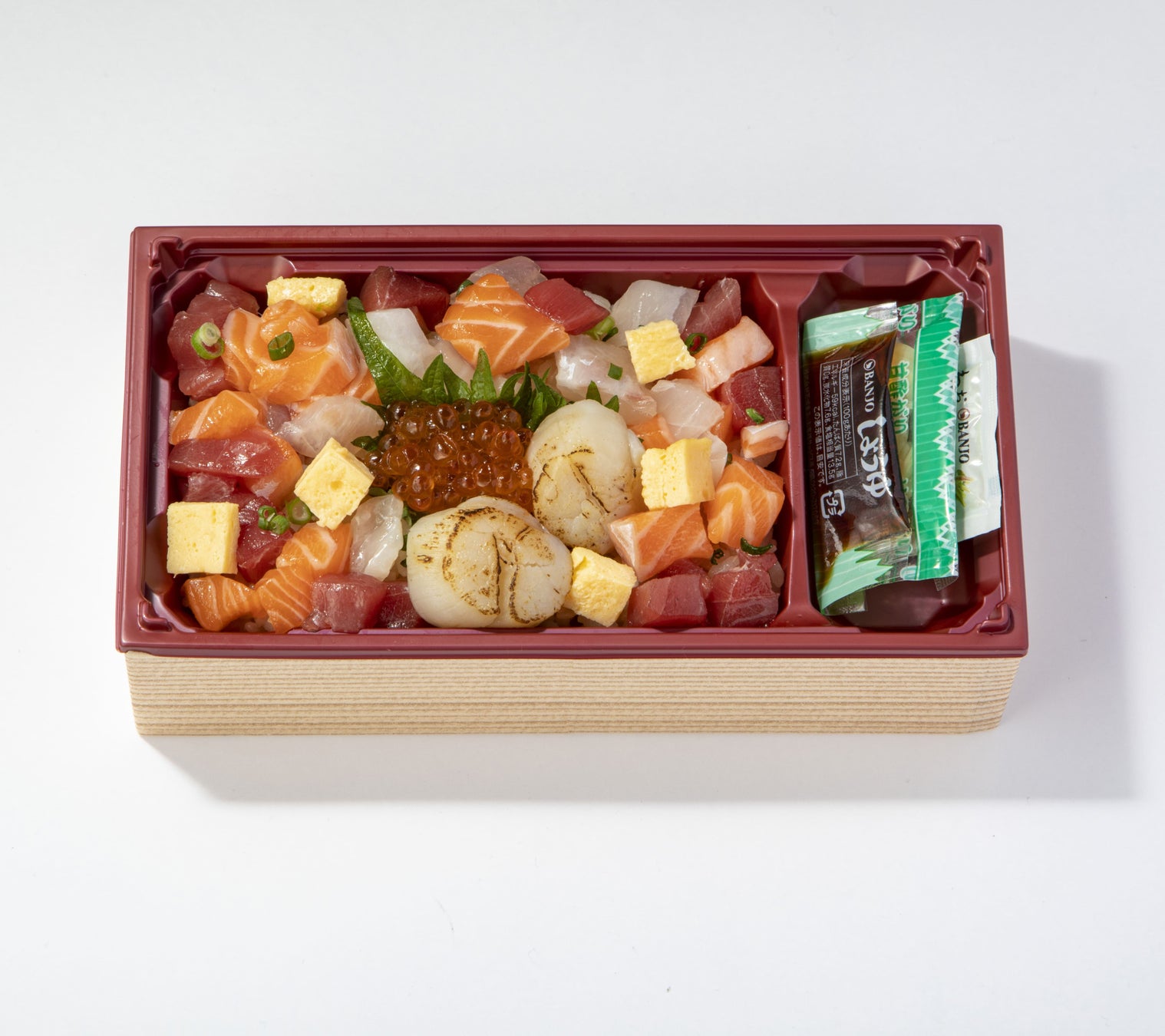 マグロや炙りホタテ、生アトランティックサーモンなど魚屋自慢の鮮魚をたっぷり盛り込んだ海鮮ばらちらしです。
