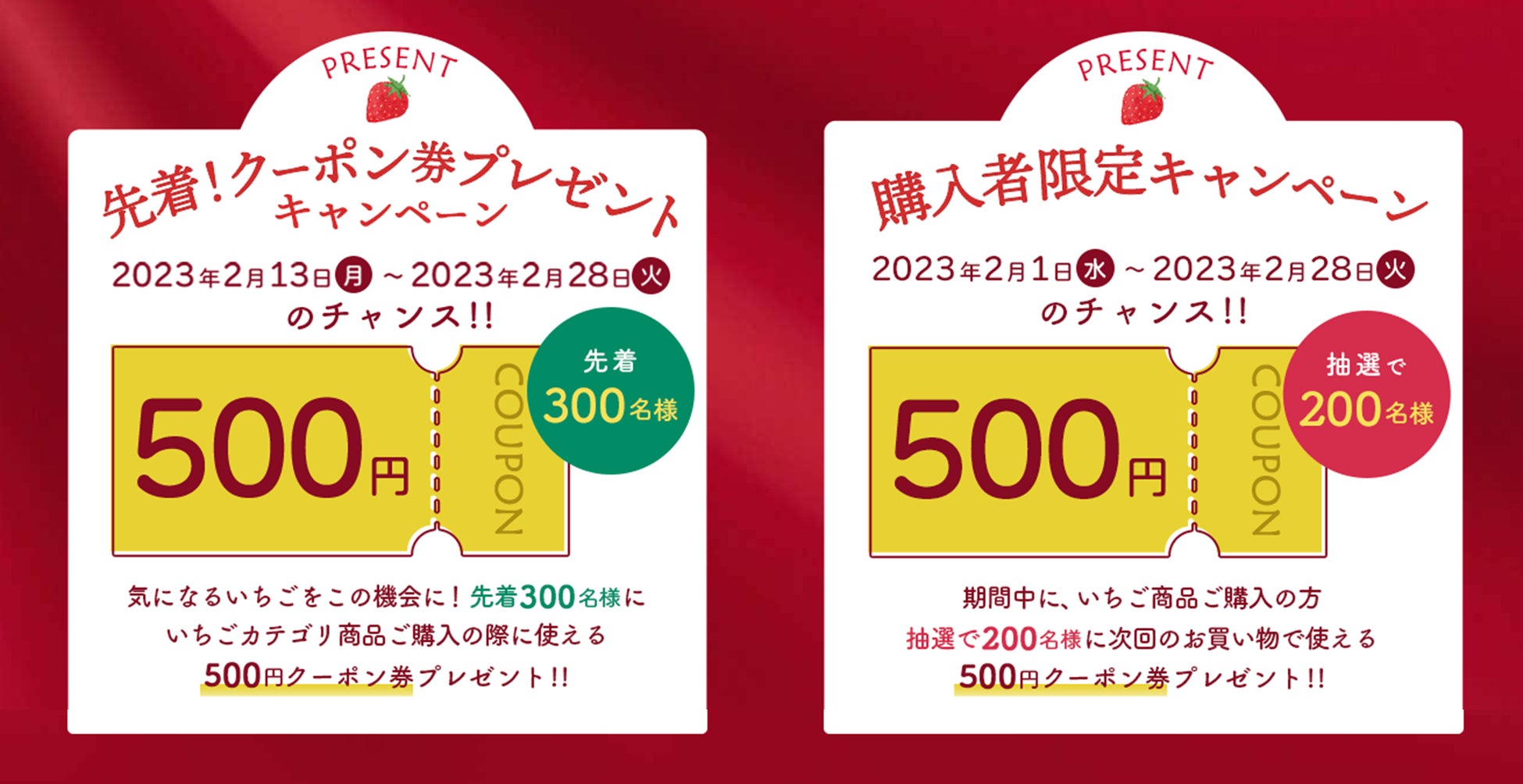 2.いちごカテゴリ商品購入で次回のお買い物で使える500円クーポンが当たるキャンペーン