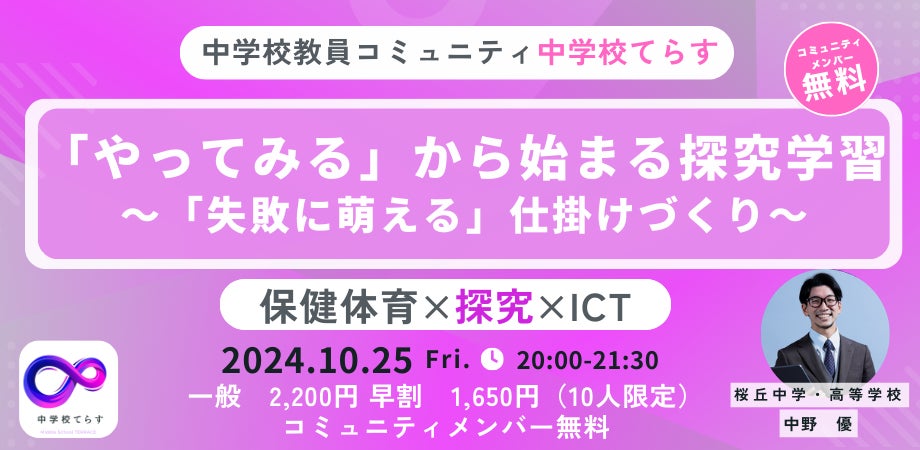 株式会社NIJIN(本社:東京都江東区、代表取締役:星野達郎)が運営する「中学校てらす」は、オンラインセミナー『「やってみる」から始まる探究学習 ~「失敗に萌える」仕掛けづくり~』を開催いたします。