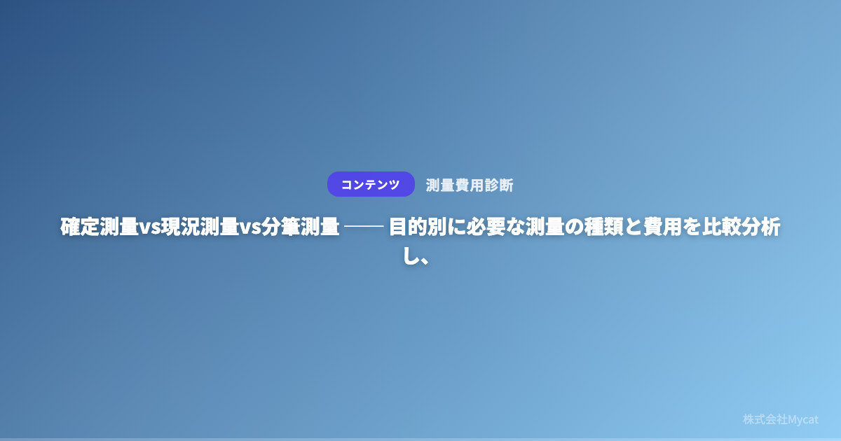 株式会社Mycat(本社:東京都目黒区)は、測量費用診断(https://sokuryo.xyz)において、利用者の目的に応じた測量種別の自動判定機能を追加したことをお知らせいたします。あわせて、日本土地家屋調査士会連合会の報酬統計をもとに、3種類の測量の違いと費用を整理しました。