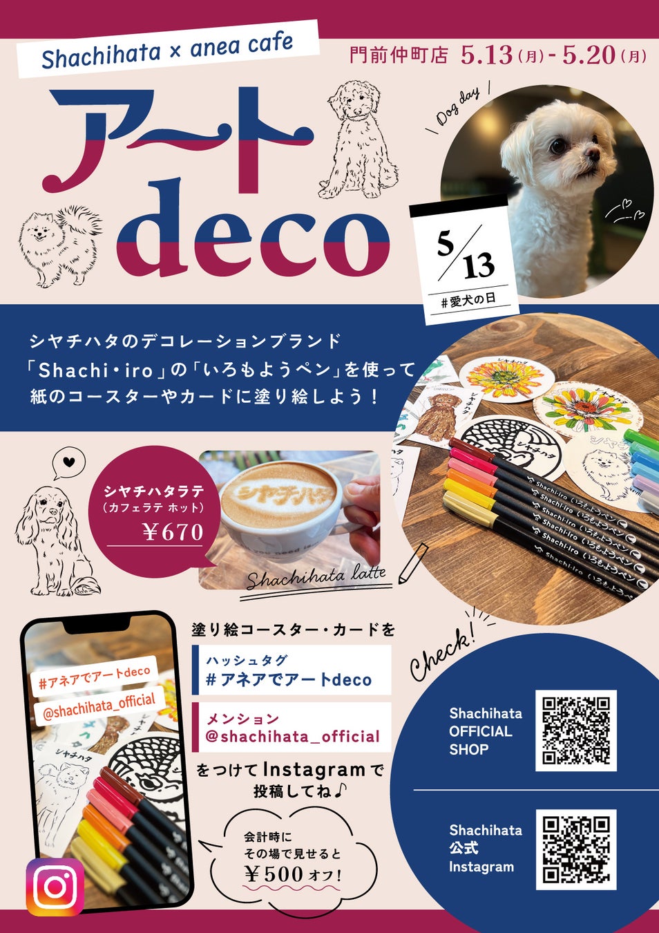 また、体験の様子をハッシュタグ #アネアでアートdeco、メンション@shachihata_officialを付けてInstagramに投稿し、会計時にレジにて投稿した画面を見せていただくと、その場で飲食代を500円割引いたします。