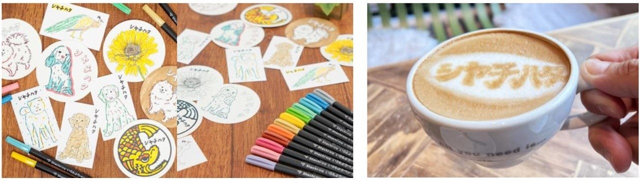 店内の各テーブルには、5月13日(月)の「愛犬の日」にちなんだかわいらしい犬などのイラストが描かれた紙コースターやカードと、「いろもようペン」をご用意。カフェでゆったりとくつろぎながら塗り絵をお楽しみいただけます。また、イベント期間限定メニュー「シヤチハタラテ」(税込670円)を販売。シヤチハタオリジナルのラテアートをご注文いただけます。