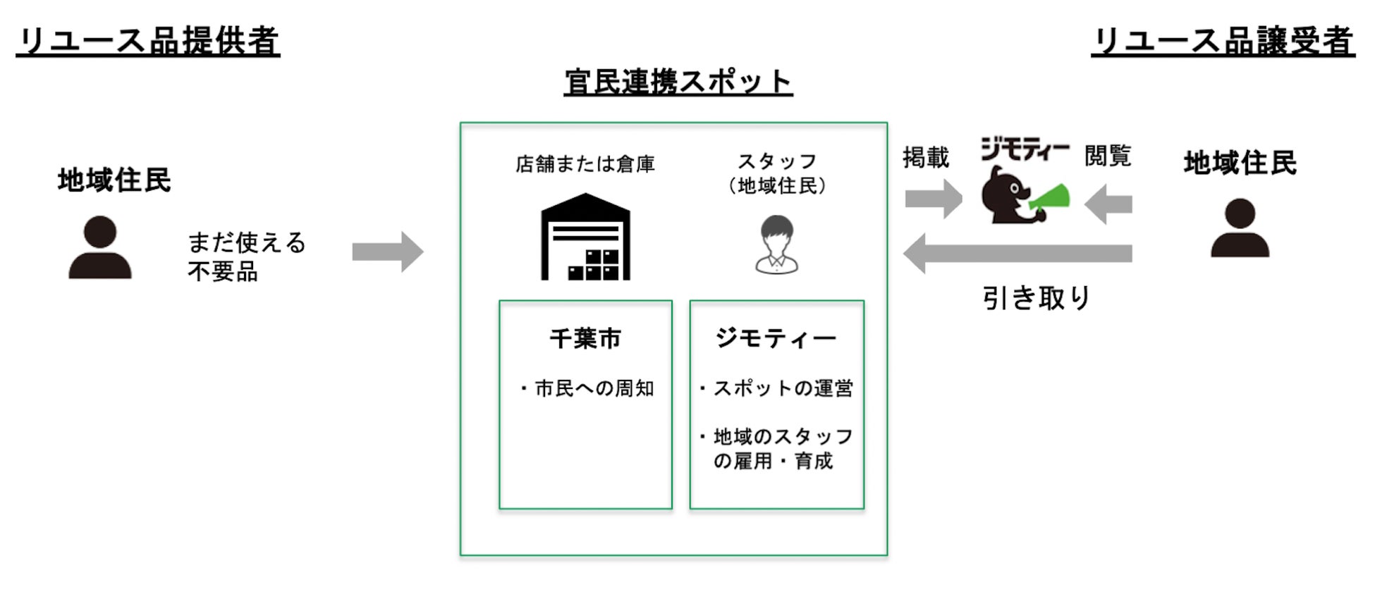 ジモティースポットは、「不要になったけれどもまだ使えるモノ」を地域のコミュニティ内で有償または無償で譲り合うことが出来るサービスです。持ち込み希望の方は、ジモティースポットに持ち込むだけで、手軽に必要とする人に譲渡することができます。そして、譲り受け希望の方は、持ち込まれたモノの情報をジモティーで検索し、ジモティースポットで引き取ることでマッチングが成立する仕組みとなっています。
