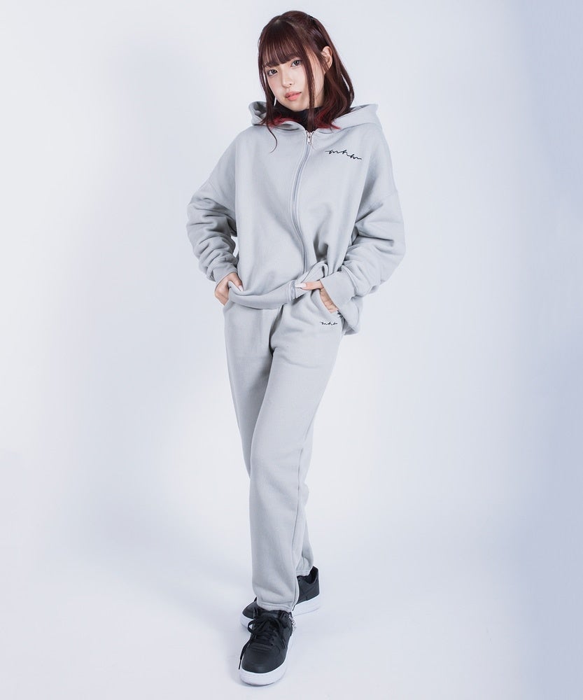 ジップパーカーやセットアップのショート丈トップスとの組み合わせも可能なスウェットのロングパンツ。