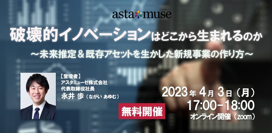 アスタミューゼ株式会社(本社:東京都千代田区、代表取締役社長 永井歩)は、2023年4月3日(月)17:00-18:00に、新規事業の企画や推進に関する課題をお持ちの経営者や担当者向けの無料ウェビナー「破壊的イノベーションはどこから生まれるのか ~未来推定&既存アセットを生かした新規事業の作り方~」を開催いたします。本年1月に開催し、ご好評いただいた同タイトルのウェビナーをアップデートした内容となります。