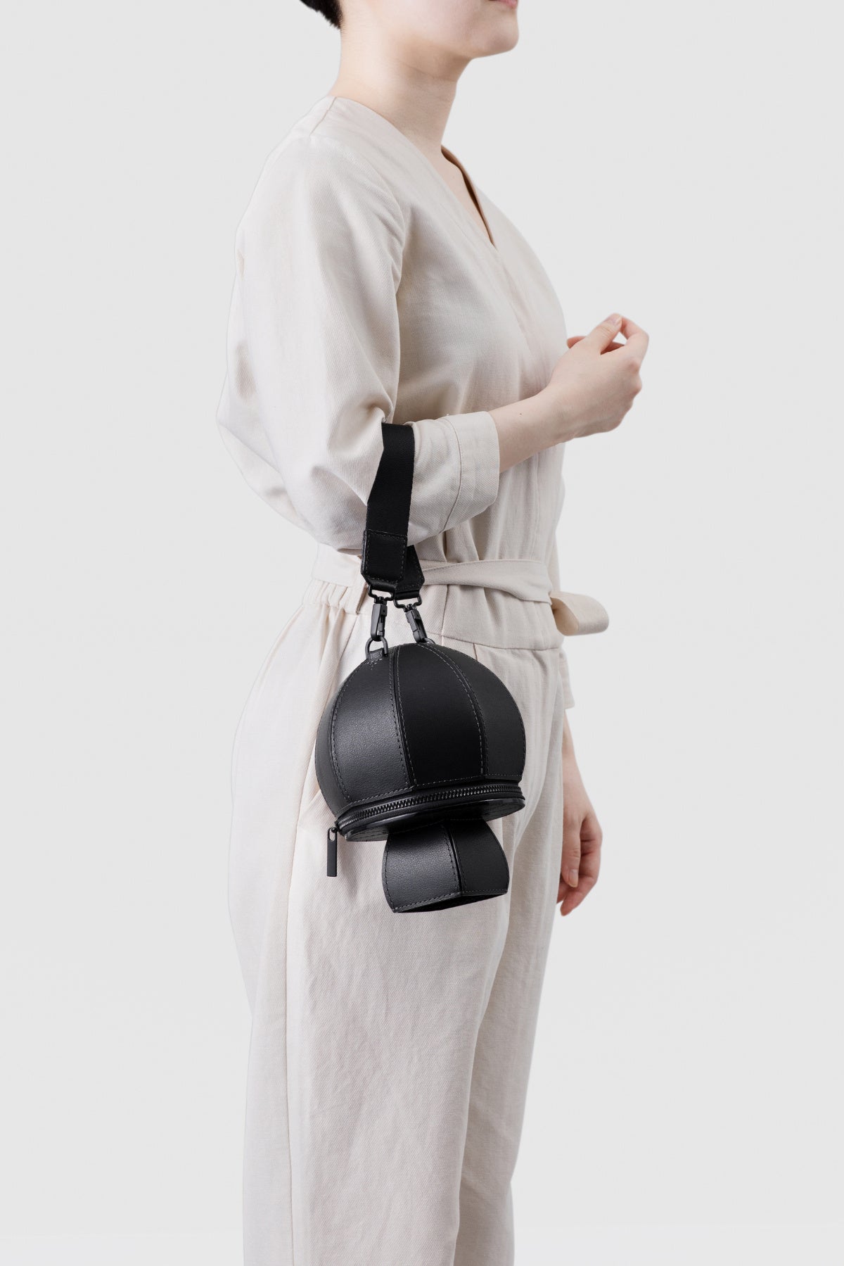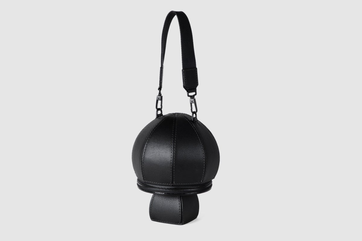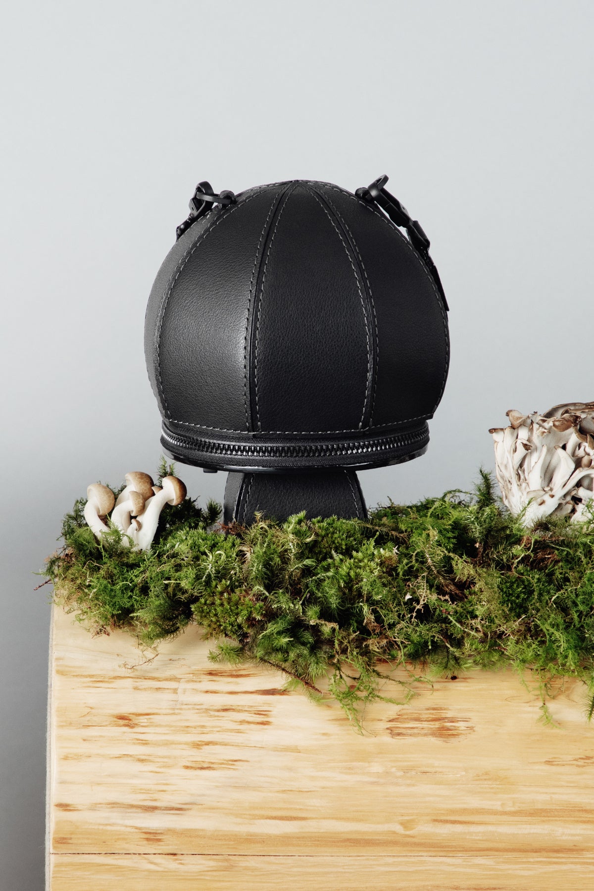 キノコ由来の新素材「Mylo™」をキノコの形に仕立てた、「持つ楽しさ」が溢れるアイコニックなハンドバッグです。球体のシルエットを平面のパーツで構成することで、キノコ形の愛らしさにモダンな印象をプラス。メイン収納の傘部分は最小限の小物が入れられ、「柄」部分はアクセサリーなどをしまえるポケットになっています。ファスナーなども黒系で統一し、アクセサリー感覚でコーディネートできる洗練された雰囲気です。